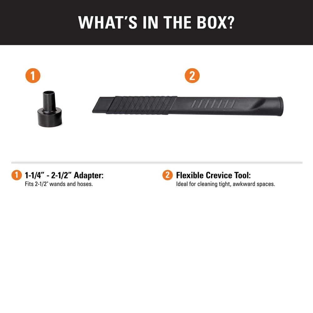The RIDGID wet/dry vac flexible crevice tool is ideal for cleaning tight, awkward spaces. Because of the unique combination of hard resin and a rubberized nozzle tip, this crevice tool provides you with flexibility and easy maneuvering. Because of the included adapter, this vacuum tool adapts to most all wet/dry vacuums with a 2-1/2 in. or 1-1/4 in. diameter hose.