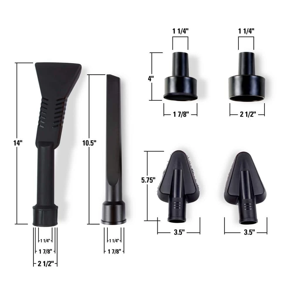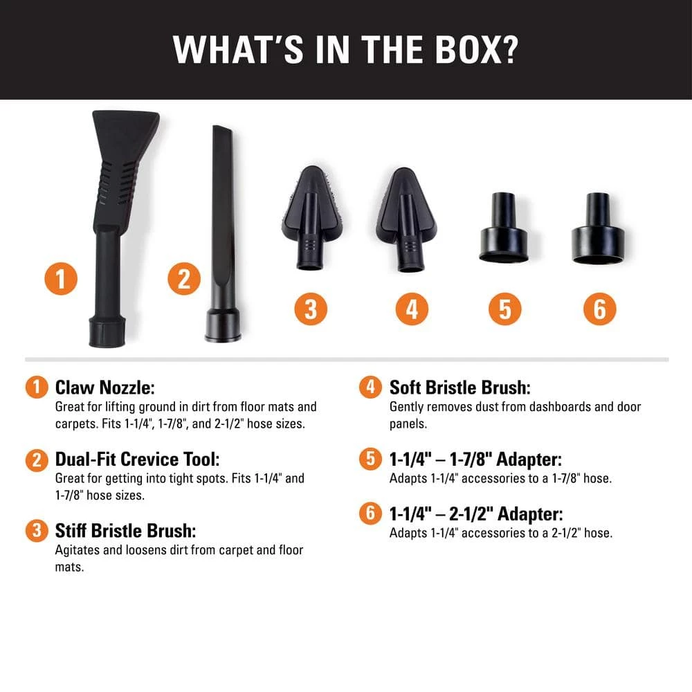 The RIDGID Wet Dry Vac 1-1/4 in. Car Cleaning Accessory Kit is an ideal collection of accessories for interior car cleaning. Efficiently detail your car or truck with these specially designed tools. This kit features 6 accessories; a soft bristle brush, stiff bristle brush, dual-fit crevice tool, multi-fit claw nozzle, and (2) step down adapters (to connect 1-1/4 in. accessories to a 2-1/2 in. hose or a 1-7/8 in. hose).
