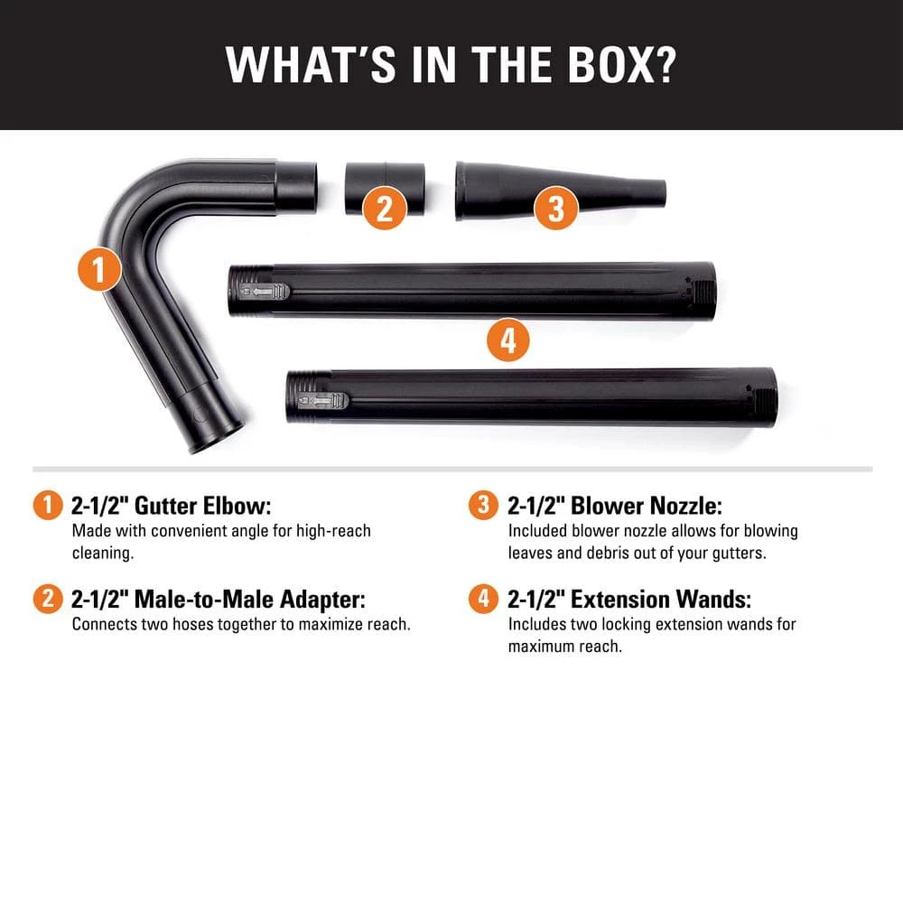 - Includes: gutter elbow, 2 locking extension wands, blower nozzle, male-to-male adapter