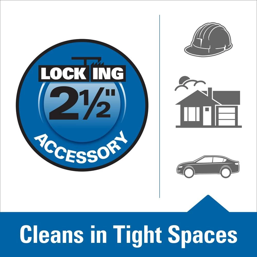 RIDGID 2-1/2 in. locking crevice tool is designed to clean in tight spaces not normally accessible by other cleaning methods. With the new locking design, your accessory locks onto the hose or wand so it wont fall off during use. Easily detach by releasing the locking tab or twisting off. The 2-1/2 in. opening is the optimal size for tackling large messes with a RIDGID wet dry vac. Max your VAC and get the most out of your cleaning tools with RIDGID 2-1/2 in. locking accessories.