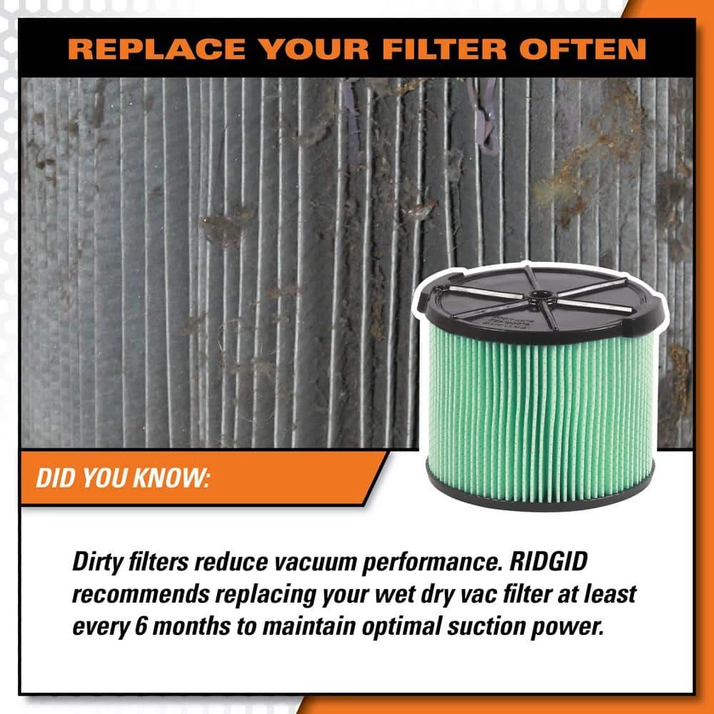 - RIDGID always recommends the use of a cartridge filter for dry pickup and to replace filters often for optimal vacuum performance and to prolong the life of the vac