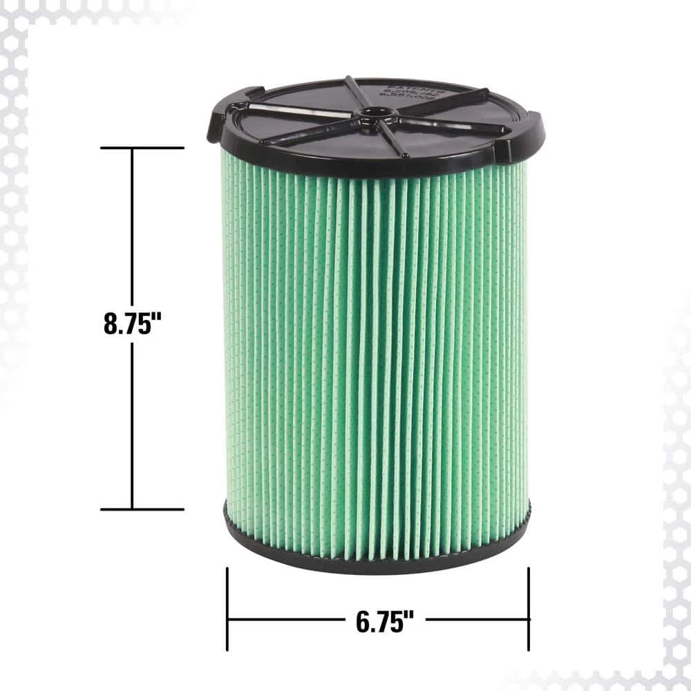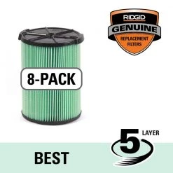 Have a RIDGID wet/dry vacuum filter on hand whenever the job calls for it with this 8-count, 5-layer pleated paper filter value pack – buy more and save more. The 5-layer filtration system captures allergens and traps particles such as everyday dirt, drywall dust, pollen, and pet dander. The replacement filter can be washed and, if dried properly, reused. Changing shop vac filters often is strongly recommended to increase the vac’s performance and to help extend vacuum life as it protects the motor from harmful dust and debris. The 5-layer fine dust filter fits all RIDGID wet/dry shop vacs 5 Gal.s and larger and should only be used for dry pickup. RIDGID provides other filtration offerings, including VF5000 Fine Dust Filter (sold separately) and VF7000 Wet Filter (sold separately), depending on the job application and type of cleanup mess. Also, a range of value pack sizes (2-count, 4-count and 16-count) are available to accommodate a variety of project needs. With its patented Qwik Lock feature, the filter simply snaps on or off the shop vacuum for easy cleaning and to quickly switch filter options.