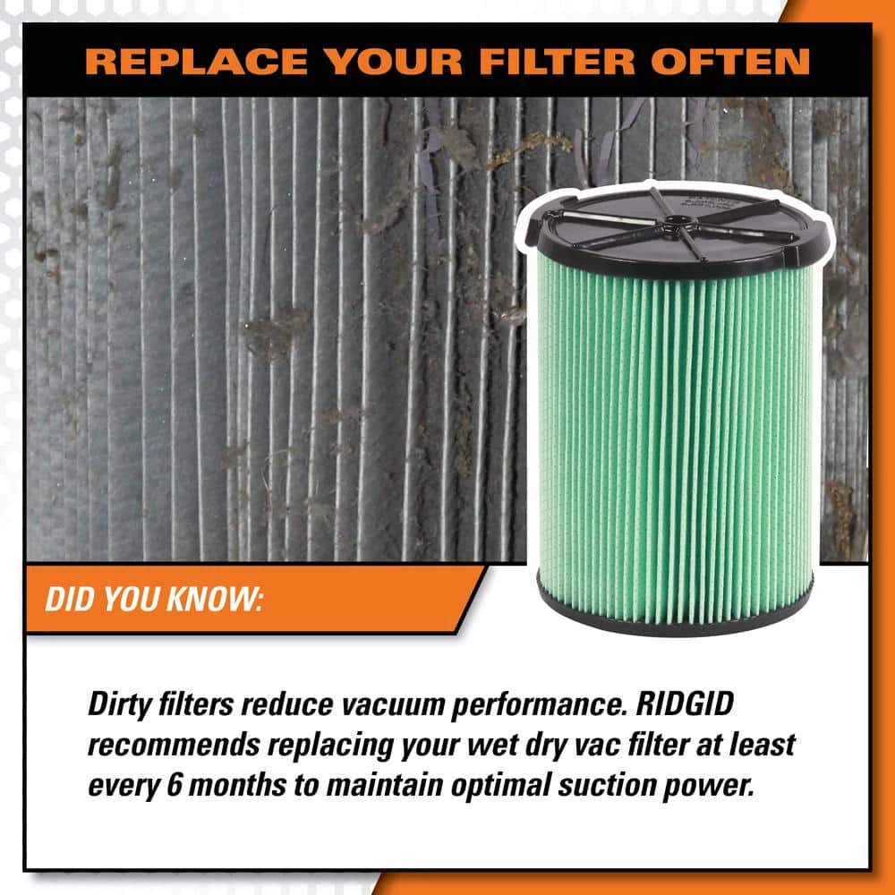 - RIDGID always recommends the use of a cartridge filter for dry pickup and to replace filters often for optimal vacuum performance and to prolong the life of the vac