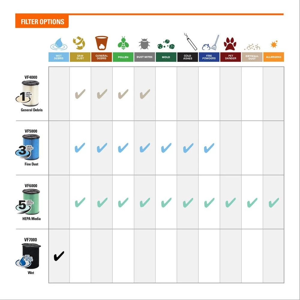 - You may also like – RIDGID standard filter (VF4000; sold separately) for general dirt and debris and fine dust filter (VF5000; sold separately) for fine powders and mold