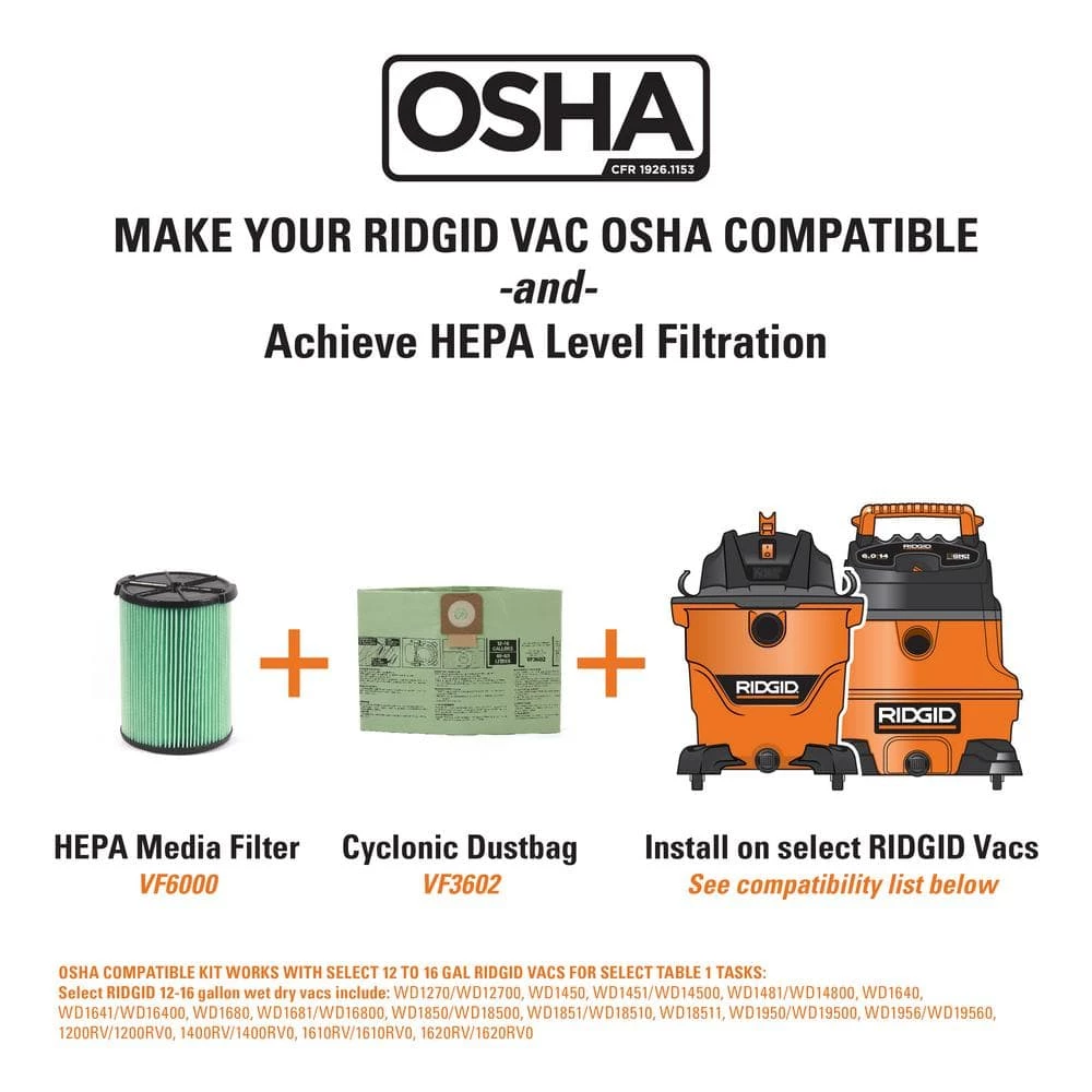 - RIDGID also offers a line of shop vac dust collection bags which can assist with debris containment and allow easy debris disposal (VF3502 – 12 to 16 gal; sold separately and VF3503 – 5 to 10 gal; sold separately)