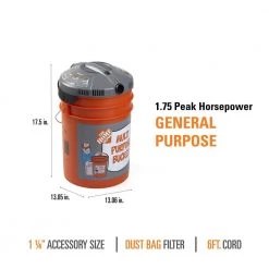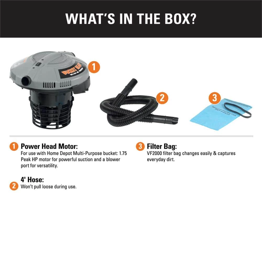 The Bucket Head Wet/Dry Vac Powerhead can be used to turn a The Home Depot brand 5 gal. multi-use bucket (sold separately) into a powerful wet dry vacuum. The powerhead features a 1.75 peak horsepower motor for powerful suction and securely locks to the bucket for a perfect fit. Quickly change and switch between full buckets to minimize drum cleaning. For added versatility, the powerhead also includes a built-in blower port. Because of its compact size and easy portability, this shop vac is perfect to use as a car vacuum cleaner or easily transport it from jobsite to jobsite. This vac comes with a 1-1/4 in. x 4 ft. hose, a 6 ft. power cord, and a filter bag. Replacement filters can be purchased in a 3-pack (VF2000; sold separately), which helps to capture everyday debris and dirt. Additional 1-1/4 in. vacuum cleaner attachments can be purchased and used on the hose for specialized cleaning.