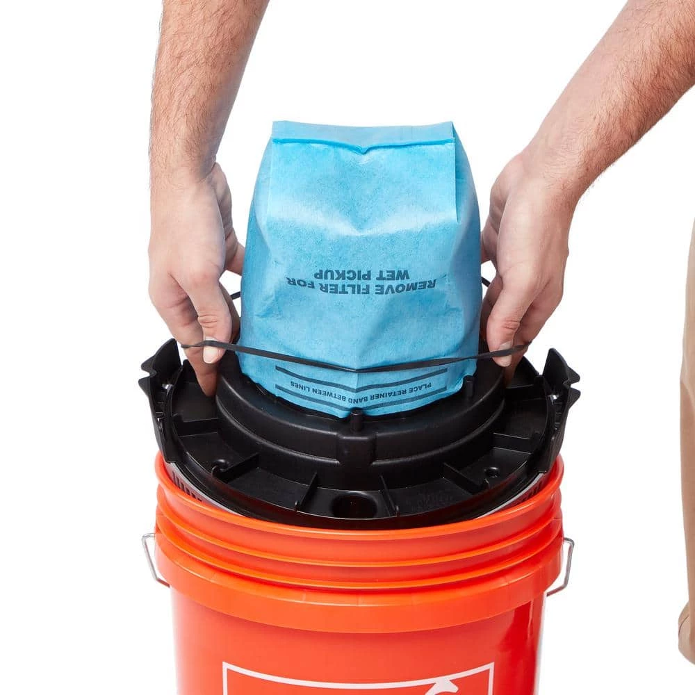 - Includes Bucket Head Wet/Dry Vac Powerhead for Home Depot 5 gallon buckets, 4 ft. hose and filter bag to create The Home Depot branded multi-use bucket (sold separately) into a wet/dry vac