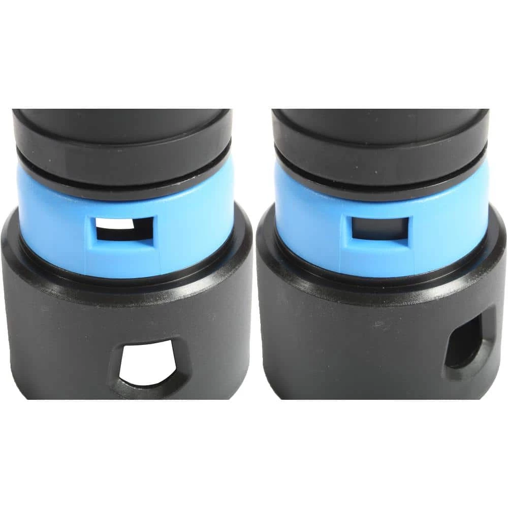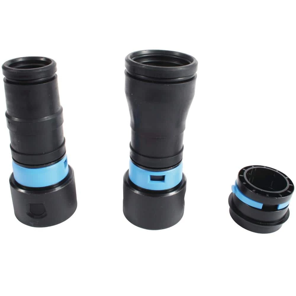 - Comes with quick click system for connecting to the exhaust port on all major brands of hand held and stationary power tools, collar with clip ring, a bayonet fitting with a 1 in. soft TPE fitting, and a second bayonet with a soft 1.5 in. TPE fitting are designed to accept and hold exhaust ports designed to fit the hose internally or externally as demanded by the power tools design, changing from one end fitting to the other takes a few seconds and offers a smooth 360° swivel connection to prevent the hose from kinking or restricting movement of the power tool