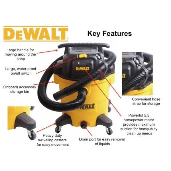 The DEWALT 12 Gal. Poly Wet/Dry vacuum features a single stage motor. On the job or in the shop this vacuum delivers the ideal combination of performance, drum capacity and convenience. This is a powerful vacuum reaching 5.5 peak HP. It is designed with a convenient 20 ft. cord and a 7 ft. hose.