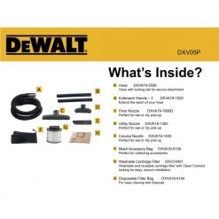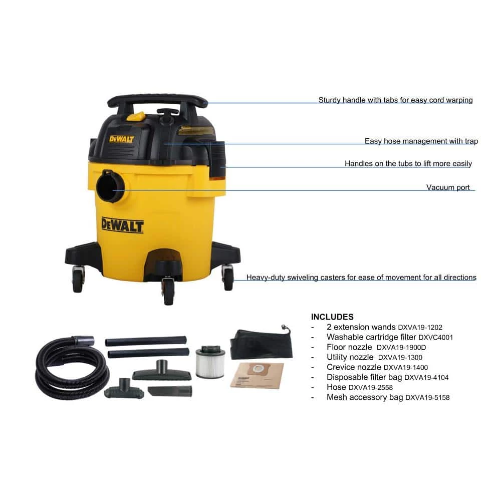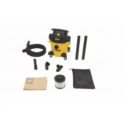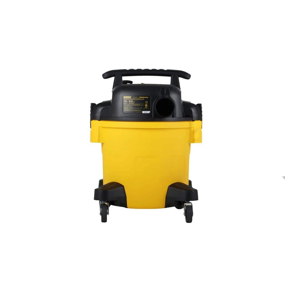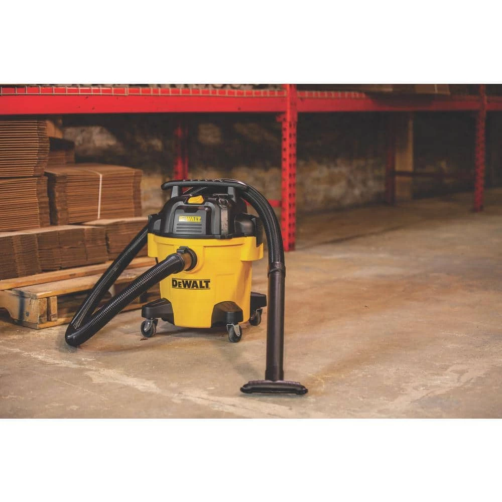 The DEWALT DXV05P 5 Gal. wet/dry vacuum is convenient for small clean-up jobs. With a powerful motor, this vacuum provides maximum suction power for heavy-duty pickup. It features a strong handle for easy carrying, large on/off switch with water-resistant design, and swiveling casters to provide ease of movement in any direction.