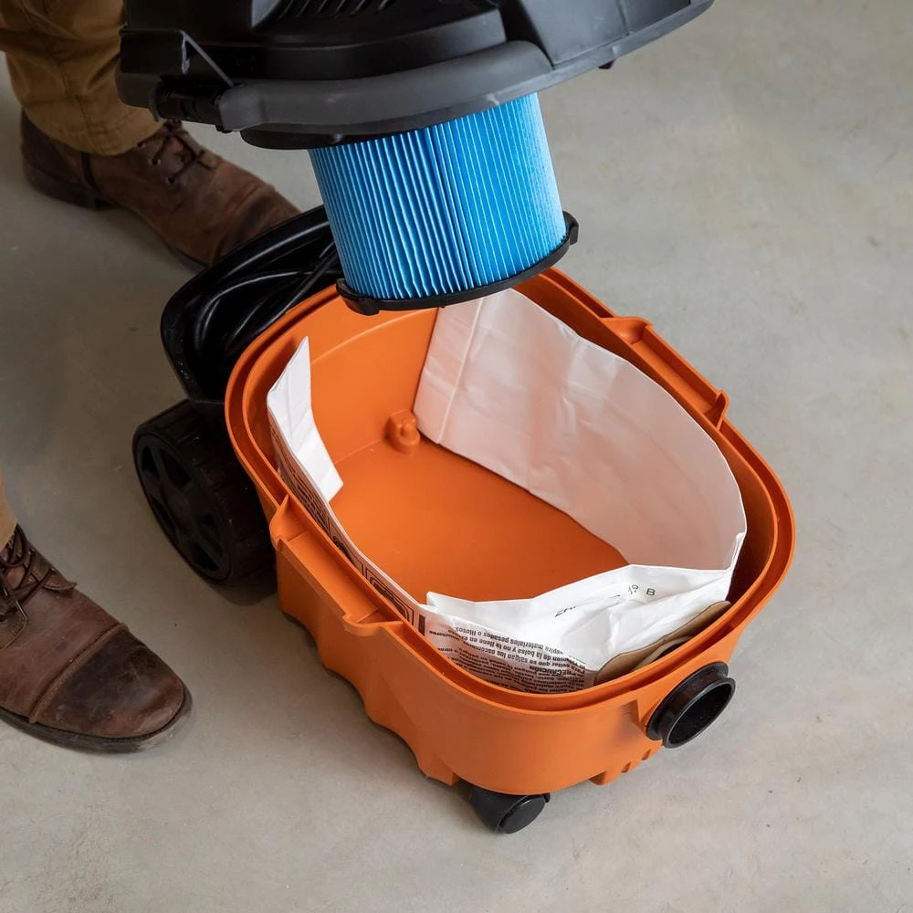 - Pair your dust bag with a shop vac filter for dry pickup and to help optimize vacuum performance – Use the RIDGID standard filter (sold separately) for general dust and debris and the HEPA media filter (sold separately) for drywall dust