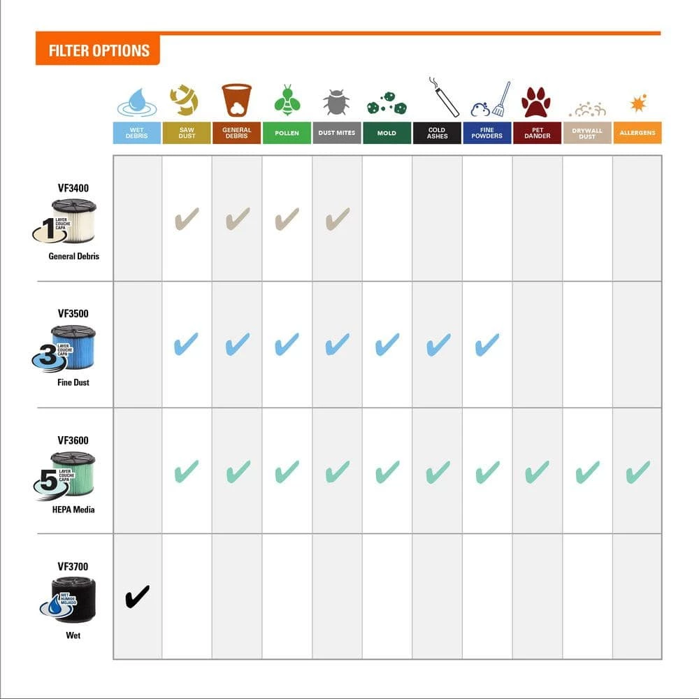 - Also available in a variety of RIDGID dust collection bags and larger size filters to fit your size vac (sold separately)