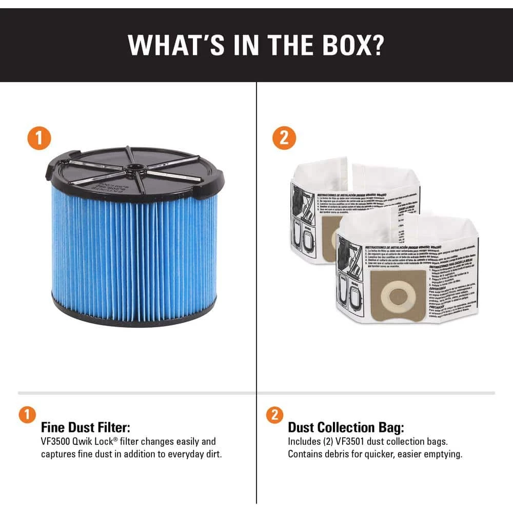 - Includes 1 RIDGID Fine Dust Filter (VF3500) and 2 RIDGID Dust Bags Size C (VF3501) for RIDGID wet/dry shop vacuums – dry pickup only
