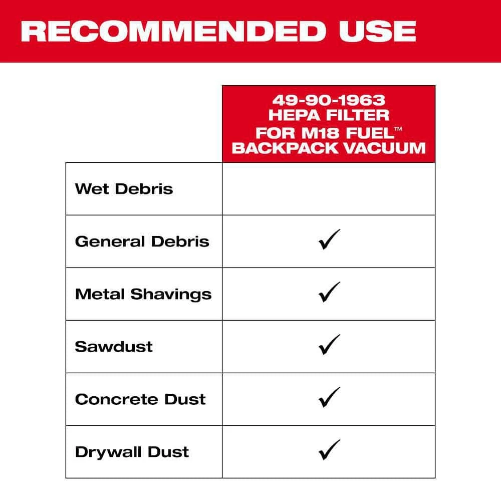 - HEPA filter works on the M18 FUEL 3-in-1 backpack vacuum (0885-20, 0885-21HD)
