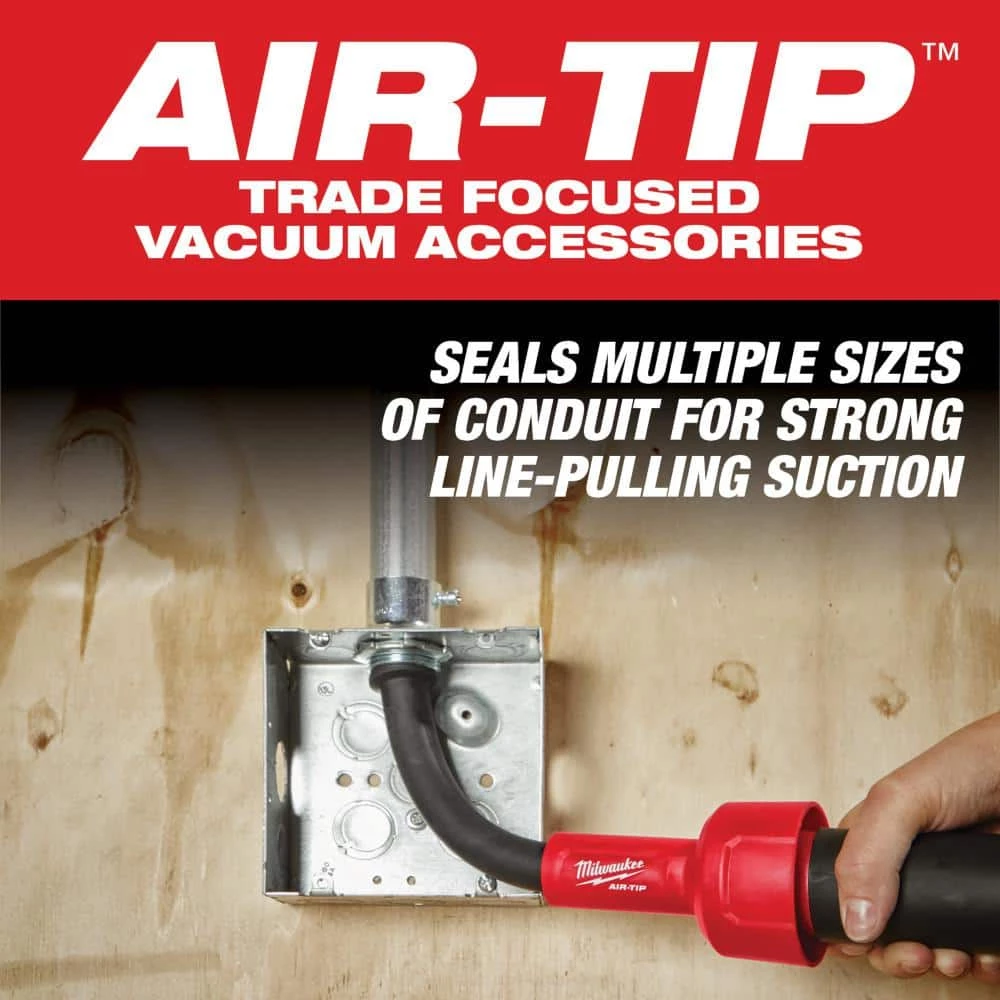The Milwaukee AIR-TIPConduit Line Puller Kit is designed for electricians to seal multiple conduit sizes for strong line-pulling suction. This conduit pull line kit includes three different tools to aid users in line pulling applications, a flexible design tip for use on 1/2 in. – 1 in. conduit, a flexible design tip for use on 1-1/4 in. – 1-1/2 in. conduit, and a 2 in. – 4 in. conduit tip. The rubber cone seal ensures strong fitment to pipes. The flexible design on the smaller conduit tips allows for tight area fitment inside boxes or panels. The AIR-TIPConduit Line Puller Kit is compatible with other wet/dry vacuum brands that include 1-1/4 in. , 1-7/8 in. , 2-1/2 in. diameters, and is part of the AIR-TIPfamily of Trade Focused Vacuum Accessories.