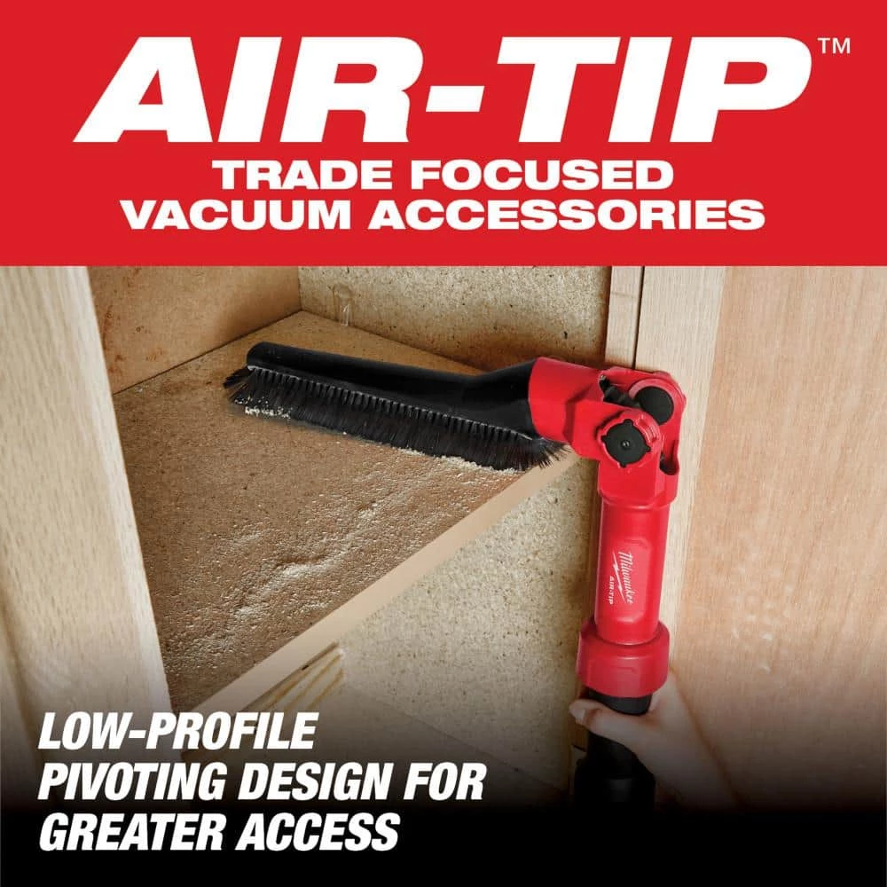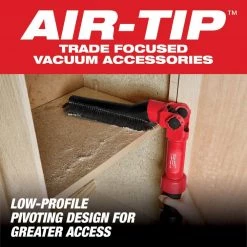 The MILWAUKEE AIR-TIP Low-Profile Pivoting Brush Tool has greater cleaning access in a variety of cleaning situations with it’s pivoting design and low-profile head. The pivoting joint is easy to engage with a button press, so multiple orientations of cleaning overhead, waist-level, or below can be achieved. In addition, the low profile brush head can be swiveled 360 degrees for even more cleaning versatility. The AIR-TIP Low-Profile Pivoting Brush Tool is compatible with other wet/dry vacuum brands that include 1-1/4″, 1-7/8″, 2-1/2″ diameters, and is part of the AIR-TIP family of Trade Focused Vacuum Accessories.