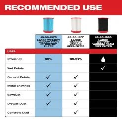 The MILWAUKEE Large Wet/Dry Vacuum HEPA Filter is compatible with multiple MILWAUKEE Wet/Dry Vacuums (0910, 0920, 0930, 0931). When installed, the HEPA Filter captures 99.97% of all particles greater than 0.3 microns for fine dust collection. It ensures optimal dust and microparticle collection on debris such as concrete dust, sawdust, and drywall dust. Quickly swap or clean filters with the easy access quarter turn design. The MILWAUKEE Large Wet/Dry Vacuum High Efficiency Filter is dry cleanable and washable with water when necessary. This product contains (1) HEPA Filter.