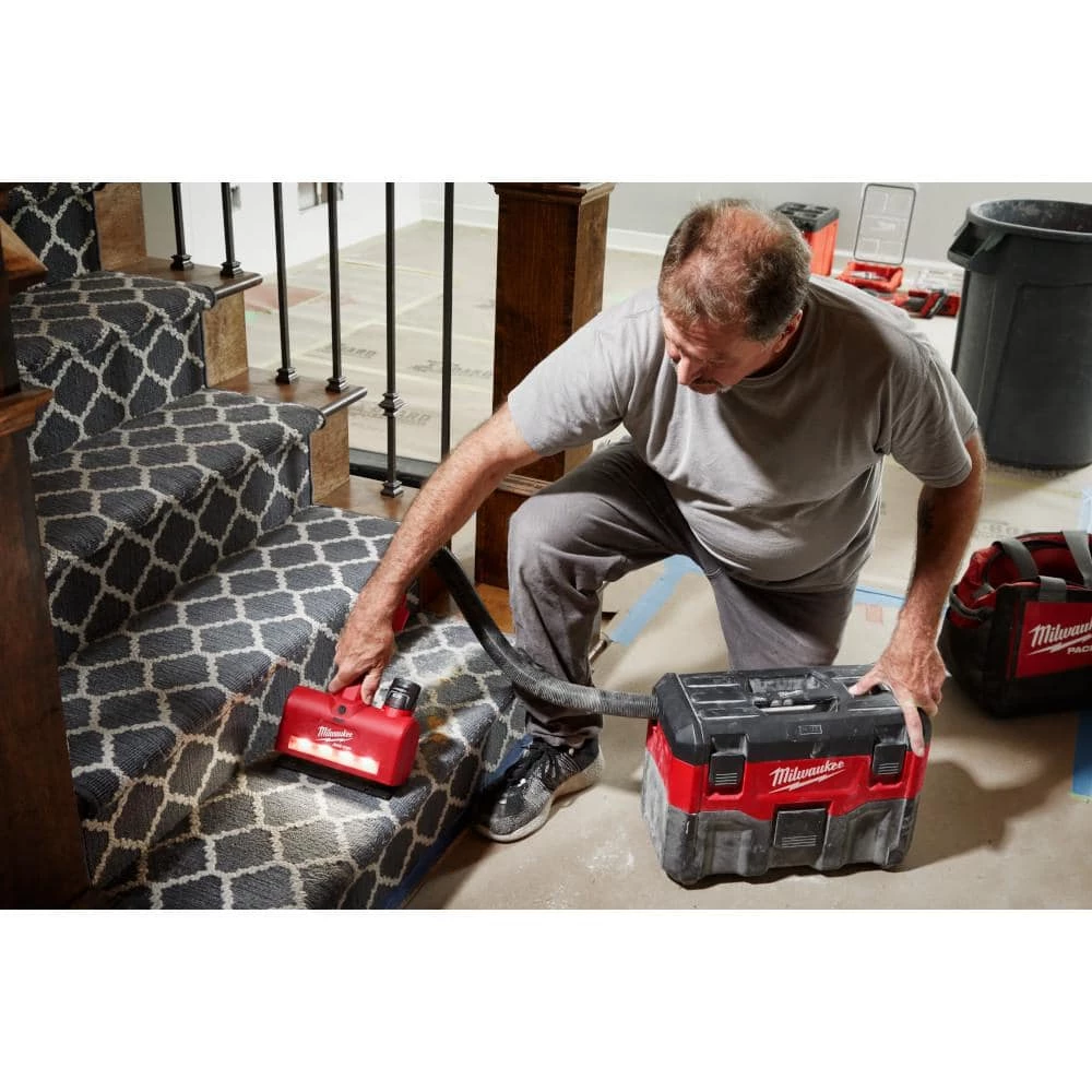 The Milwaukee M12 AIR-TIP Utility Nozzle makes jobsite cleanup easier with a powered brush roll that agitates debris for deep cleaning applications. The powered brush roll turns on at the push of a button and is powered by an M12 REDLITHIUM Battery. Paired with a vacuum that is turned on, the Utility Nozzle will be able to clean up more debris in one pass for increased productivity. A suction control valve allows for ease of use on a variety of carpets and substrates. The LED lights provides adequate visibility for cleaning in low-lit environments. The tool-free brush roll removal delivers easy maintenance when needed. The M12 AIR-TIP Utility Nozzle is compatible with other wet/dry vacuum brands that include 1-1/4 in., 1-7/8 in., 2-1/2 in. diameters and is part of the AIR-TIP family of Trade Focused Vacuum Accessories.