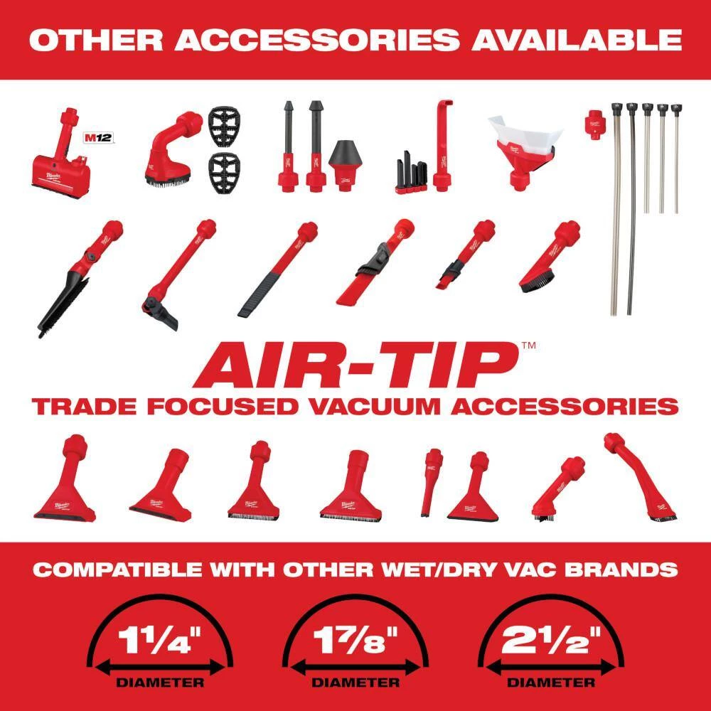 - Kit includes: 0880-20 M18 18-Volt 2 Gal. lithium-ion cordless wet/dry vacuum, 49-90-2040 AIR-TIP 1-1/4 in. – 2-1/2 in. claw utility nozzle W/Brushes Wet/Dry Shop Vacuum Attachment and 49-90-2032 AIR-TIP 1-1/4 in. – 2-1/2 in. magnetic utility nozzle wet/dry shop vacuum attachment