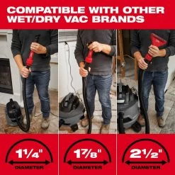 The Milwaukee M18 Cordless 2 Gal. Wet/Dry Vacuum provides users with a Powerful and Portable Wet/Dry Clean-up tool. A high performance motor creates powerful suction for both wet and dry applications. The Milwaukee M18 Cordless 2 Gal. Wet/Dry Vacuum has a stackable design and organized on-board storage that keeps all of the attachments inside the unit for convenient transport and storage. The 0880-20 Milwaukee M18 Cordless 2 Gal. Wet/Dry Vacuum comes with a flexible hose, crevice tool, utility nozzle and a certified HEPA filter. The Milwaukee AIR-TIP Claw Utility Nozzle with Brushes makes handheld cleanup more effective with its ergonomic claw grip and integrated brushes that agitate debris. The Milwaukee AIR-TIP Magnetic Utility Nozzle has integrated magnets that catch metal hardware, preventing damage to bags and filters inside of a wet/dry vacuum. Kit Includes: 0880-20 M18 18-Volt 2 Gal. Lithium-Ion Cordless Wet/Dry Vacuum, 49-90-2040 AIR-TIP 1-1/4 in. – 2-1/2 in. Claw Utility Nozzle with Brushes Wet/Dry Shop Vacuum Attachment and 49-90-2032 AIR-TIP 1-1/4 in. – 2-1/2 in. Magnetic Utility Nozzle Wet/Dry Shop Vacuum Attachment.
