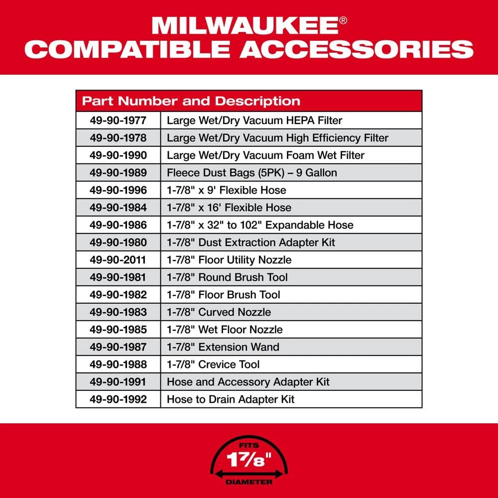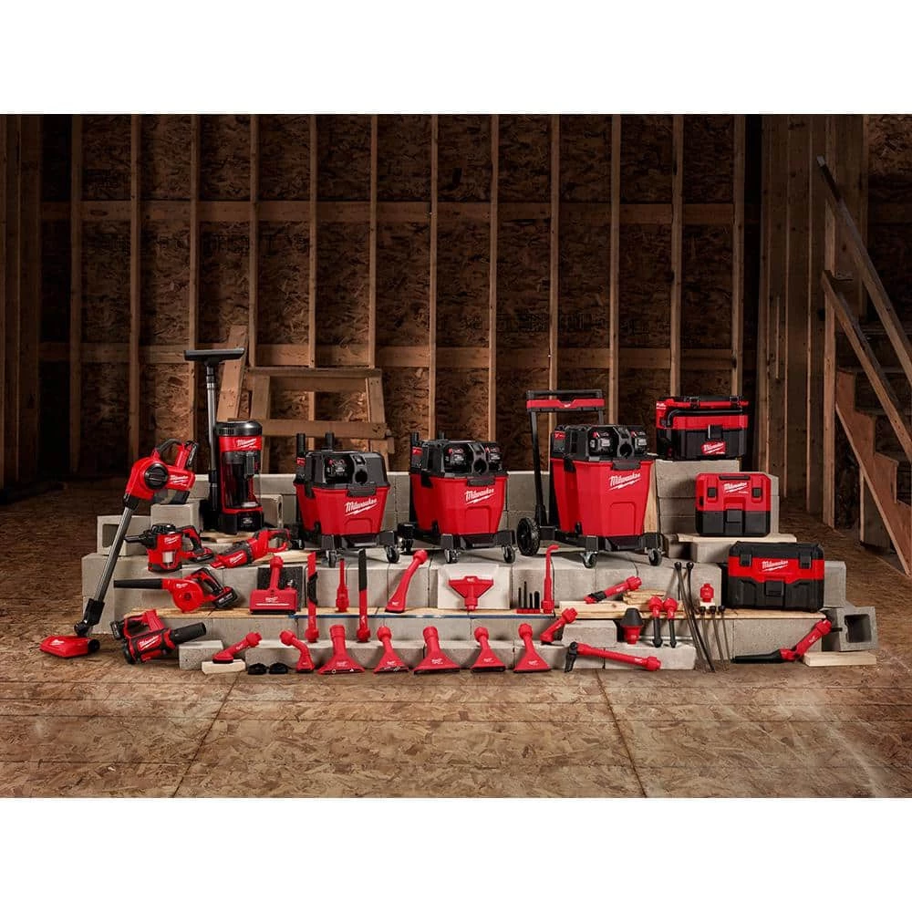 - Includes 1 M18 FUEL dual-battery wet/dry vacuum motor head, one 9 Gal. wet/dry vacuum tank, 1 wet/dry vacuum cart, 1 large wet/dry vacuum high efficiency filter, one 1-7/8 in. x 9 in. flexible hose, one 1-7/8 in. crevice tool, one 1-7/8 in. utility nozzle and two 1-7/8 in. extension wands