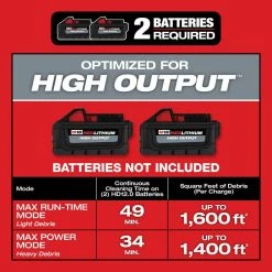 - MAX POWER MODE delivers up to 34-minutes of continuous cleaning time and up to 1,400 ft. 2 of debris clean up per charge on 2 M18 REDLITHIUM HIGH OUTPUT HD 12.0 battery packs