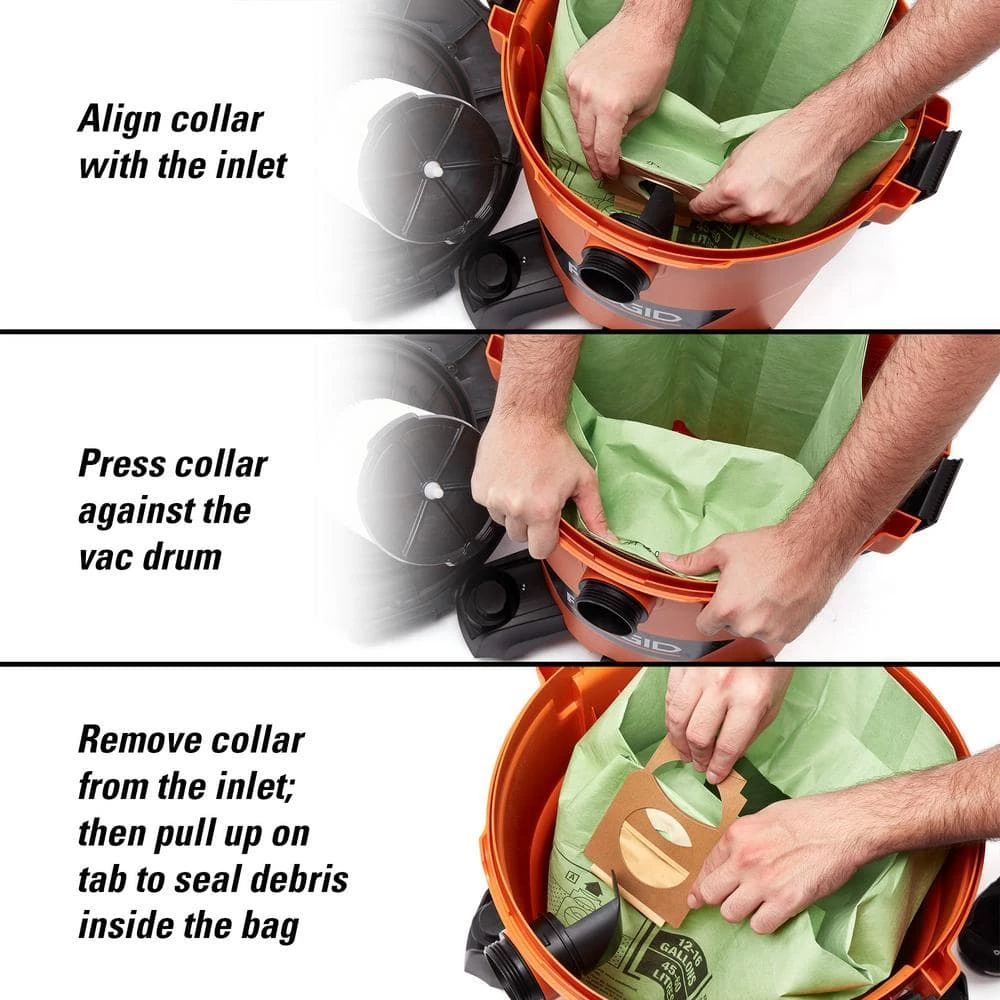 The RIDGID OSHA compatible kit with HEPA-media filter and cyclonic pre-separator dust bags includes 1 RIDGID VF6000 5-layer allergen filter and 2 RIDGID VF3602 premium cyclonic dust bags. Breath easier indoors while cleaning with this premium filtration kit.”When installed together (in select RIDGID vacs listed below), this kit is OSHA Silica Table 1 Compatible for certain dry dust collector control methods and HEPA-filtered vacuum control methods (1926.1153) within the limitations of their airflow performance. Included dust bags allow for cyclonic airflow, resulting in pre-separation and more equal distribution of fine particles and debris throughout the bag. Dust bag disposal is clean and easy with sealing collar feature. Included VF6000 filter is made from HEPA media. Compatible vacs listed below.