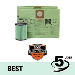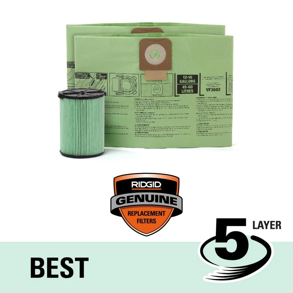 - Kit includes 2 RIDGID premium cyclonic dust bags (VF3602) and 1 RIDGID 5-layer allergen filter (VF6000) made with HEPA media