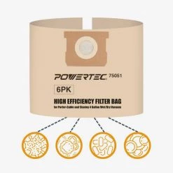 Introducing the Replacement Filter Bags intended for Porter Cable/Stanley Disposable by POWERTEC. These high efficiency filter bags were specifically designed to fit Porter Cable and Stanley 4 Gal. Wet/Dry Vacuums (see models below). They are fully disposable and can be disconnected with ease – offering exceptional convenience when the job is completed or the bag is entirely full. Whether you’ve created a small or big mess, these bags will help keep your shop and work area clean, enabling you to experience a smooth and consistent workflow (the most important thing for any professional on a schedule). Please Note: Our filter bags perform at an optimal level when used for dry pickup and collecting various types of dirt, dust and debris. Package Contains: 6 Filter Bags Compatible With: Porter Cable Wet Dry 4 Gal. Models PCX18301-4B PCX18301-4C Stanley Wet Dry Vac 4 Gal. Models SL18301-3B SL18301-4B SL18129 POWERTEC is a leading manufacturer of high quality woodworking tools and accessories, machines and an assortment of OEM replacement parts. We are committed to exceeding expectations, while bringing the latest innovations, technology and product development to the industry.