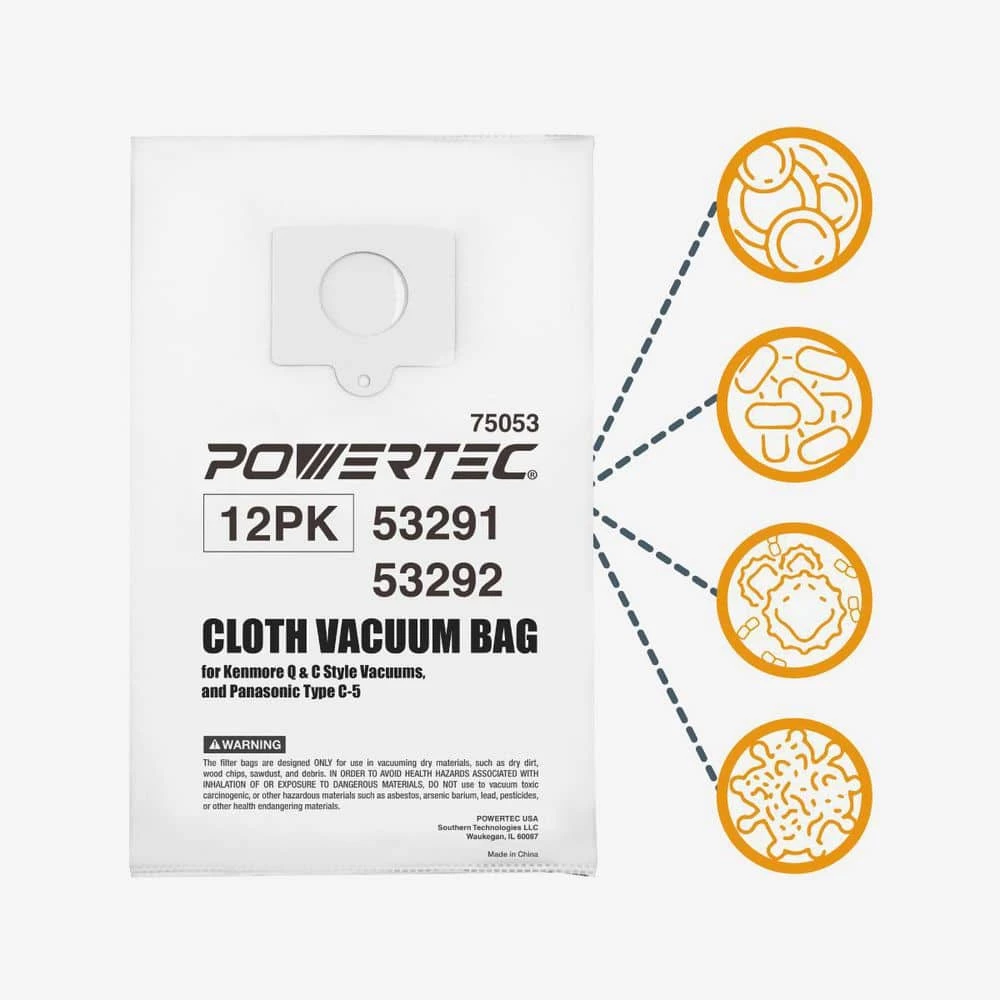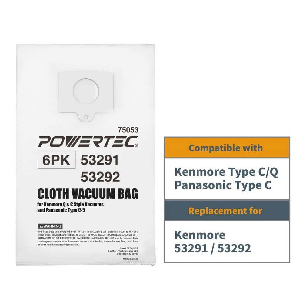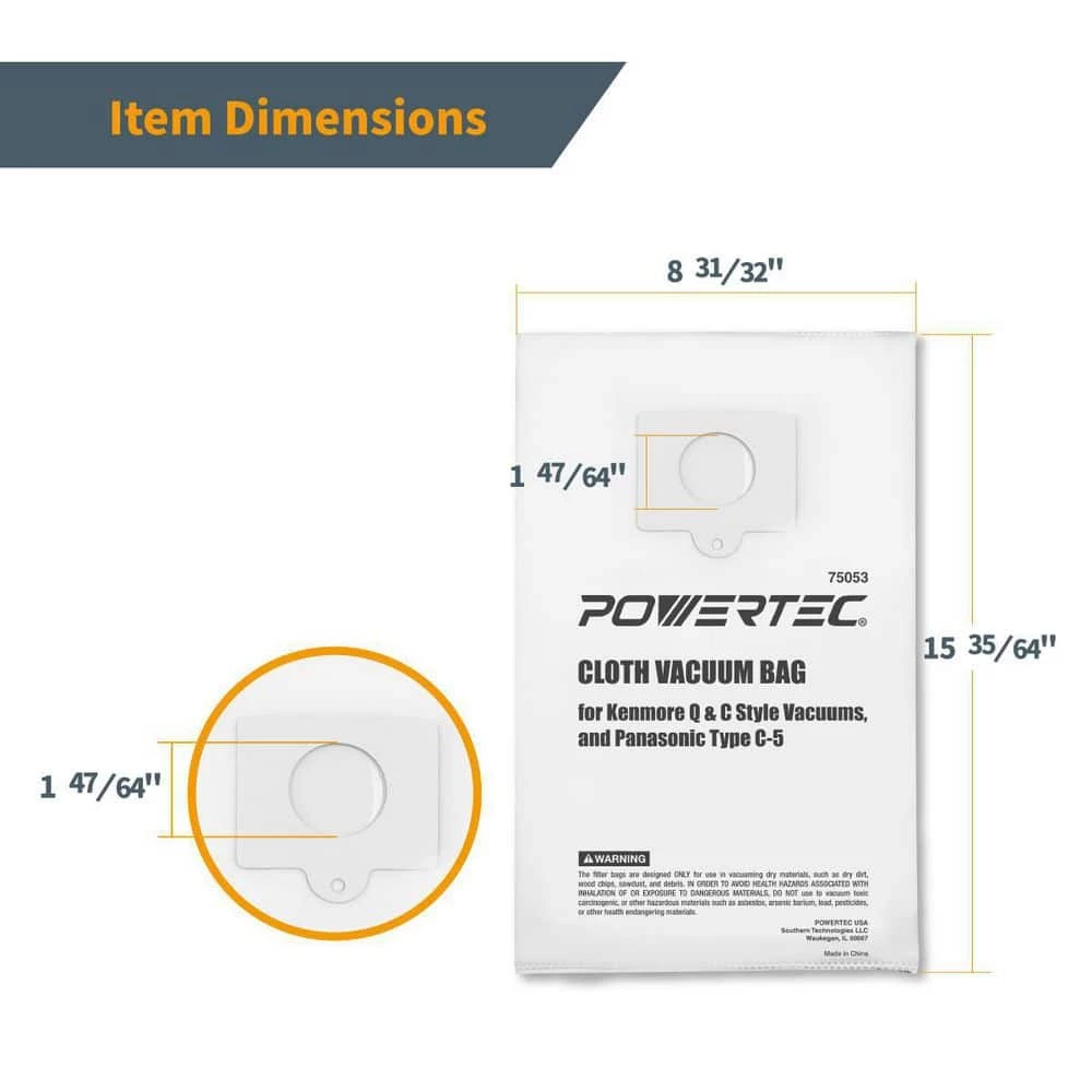 Introducing the Cloth Q/C Vacuum Bags intended for Kenmore by POWERTEC. Made with high-quality fabrics, this bag offers multiple layers. This easy-to-fit bag is durable for long-term use, but won’t clog once it’s full and is very easy to replace once it’s full. Simply slide the cardboard/rubber seal over the bag inlet opening and return to perfect dust sealing. This premium quality bag is designed to be compatible with Kenmore canister vacuum cleaners, providing a secure and snug fit for anyone using a Q and C type replacement bag. Whether you’re collecting dirt, this bag is essential to maintaining a clean, safe, and clean work environment. and healthy. With these bags, no dirt will come out. ***Compatibility: Replacements for Kenmore 53291 and 53292 bags.// Designed To Fit Kenmore Canister Models 23040, 23243, 23350, 24320, 24321, 24325, 24326, 24327, 24350, 24390, 24410, 24971, 24975, 24981, 24991, 25430, 2621, 26312, 26320, 26325, 26355, 26390, 26395, 26410, 26413, 26430, 26435, 26450, 26455, 27514, 27515, 27614, 27615, 27814, 27815, 27914, 27915, 28014 & 28015 Canister Models. // Also Fits Panasonic Canister Models; Mc-cg902, Mc-cg973, Mc-v9600, Mc-cg800, & Mc-885 Series Canisters Mc-150m Or Amc-j3ep Bags. ***8-31/32″ Long x 15-35/64″ High, 1-47/64″ Fitting Diameter
