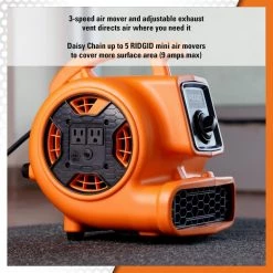 Take on projects confidently with the 12 Gal. RIDGID Wet/Dry Shop Vacuum and AM2265 CFM Blower Fan Air Mover. The RIDGID locking attachments (Dual-Flex hose, 2 extension wands, wet nozzle, utility nozzle and car nozzle) included with this 12 Gal. wet/dry shop vac focuses on cleaning small and large areas for your best clean yet. The 2 extension wands extend the overall reach for hard-to-get-to places, the locking hose with Dual-Flex offers uninterrupted cleaning through its unique locking technology and the utility nozzle is perfect for cleaning up large areas. When you need more intricate cleaning options for smaller areas, the car nozzle will do the job. Wet mess. No problem. The wet nozzle attachment is designed to squeegee liquid cleanups so you can handle your next project with ease. All these accessories can then be attached to the included 12 Gal. wet/dry vacuum with the unique locking technology for a secure connection. Combine the shop vac with the RIDGID AM2265 Mini Air Mover to dry your jobsite of any wet mess. Equipped with 600 CFM, this air mover’s high volume air circulation can be controlled by the 3-speed heavy-duty induction motor. The 2 protected outlets for Daisy Chaining, ergonomic handle and adjustable exhaust vent are included features that provide the powerful performance and rugged durability you have come to expect from RIDGID.