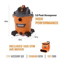 - Includes RIDGID 12 Gallon 5.0 Peak Horsepower NXT Wet/Dry Vac and RIDGID 1625 Air Mover (0.4 Horsepower, 3 Amp) – best for heavy-duty wet pickups (storms, floods, weather preparedness etc.)