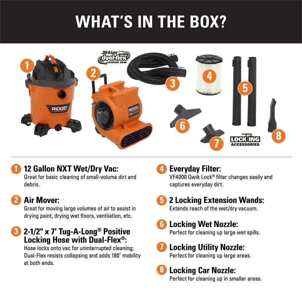 The RIDGID 12 Gal. 5.0 Peak Horsepower NXT Wet/Dry Shop Vacuum and RIDGID 1625 Air Mover is a weather preparedness kit all ready to go. This 12 gallon shop vac is great for a variety of messes, but is widely used for storms, floods and high-volume liquid pickup. This vac comes with a 7 ft. hose, wet nozzle, utility nozzle, car nozzle, 2 extension wands and a dry standard filter. The RIDGID AM2560 Air Mover has a 3-speed, heavy-duty induction motor that provides 1625 CFM with less vibration and noise. The RIDGID AM2560 Air Mover helps dry out wet areas and the efficient guard design disperses air over a larger drying space. This air mover also features an extendable, large handle and ball-bearing wheels to quickly transport to your designated area. The 12 Gal. NXT vac includes 2-1/2 in. locking accessories for a secure fit and the 2-1/2 in. diameter size resists clogs. Onboard storage for hose and accessories gives quick access to attachments. 2 locking extension wands extend reach and the wet nozzle is ideal for liquids. The vac features our patented Qwik Lock filter that makes installing or removing your filter quick, easy, and secure. Pro Tip: Add a RIDGID shop vac wet application filter (VF7000; sold separately) to a RIDGID shop vac to maintain the power of the vac and help capture waterborne debris. Add a wet and dry dust collection bag (VF3702; sold separately) to help with quick cleanup of wet and dry debris, keeping drum clean.