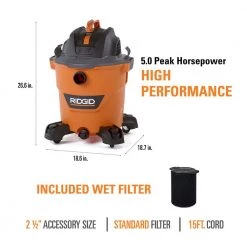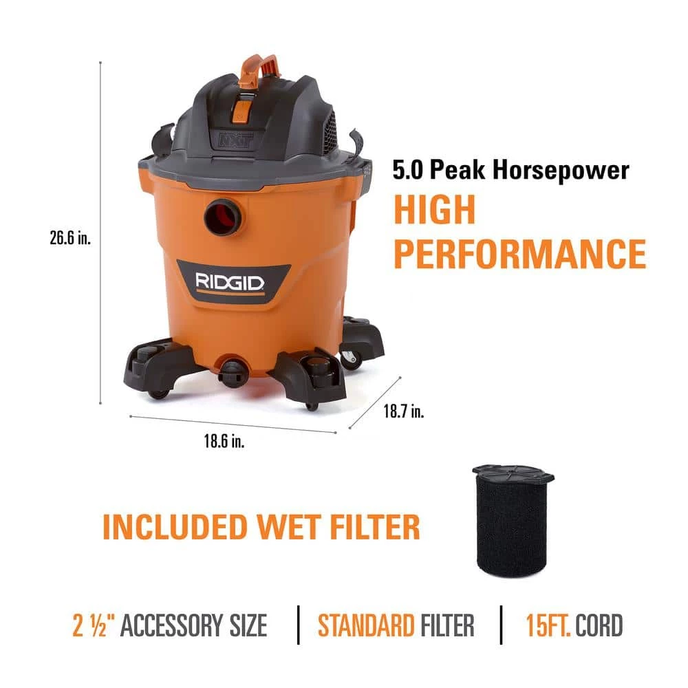 - Includes RIDGID 12 Gallon 5.0 Peak Horsepower NXT Wet/Dry Shop Vacuum featuring a standard filter and wet application filter – best for tough, moderate-sized wet or dry cleanups