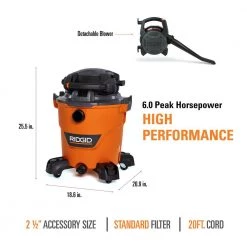 The RIDGID 12 Gallon 6.0 Peak Horsepower Wet/Dry Shop Vacuum with Detachable Blower is a 2-in-1 tool that combines pickup performance and the blower power in one product. Includes standard filter (VF4000) for trapping general dust and debris and a dust bag (VF3502; sold separately) to contain messes in one spot – drum stays clean and easy disposal between projects. This 12 gallon shop vac can be used for a variety of applications and is ideal for outdoor messes and cleanup. The all-electric blower detaches from the top of the vac and then attaches to the included locking blower wand to start clearing debris from your path. This vac includes shop vac attachments to customize to the job – 2 extension wands, utility nozzle, car nozzle, and wet nozzle. Extension wand attachments extend reach, utility nozzle cleans large areas and car nozzle helps with detail cleaning of carpet. Wet mess? No problem. The included wet nozzle attaches to suck up liquid spills faster and over larger areas. These attachments are 2-1/2 in. diameter and features locking technology for a snug fit while cleaning. Onboard storage provides spots for the 20 ft. cord and the included attachments while the comfort grip drum helps carry drum for easy lifting. Pro Tip: RIDGID recommends changing filters frequently to maintain the power of the vac and extend vacuum life – other filtration types sold separately. Add a dust collection bag (sold separately) to the vac to help with quick cleanup and disposal.