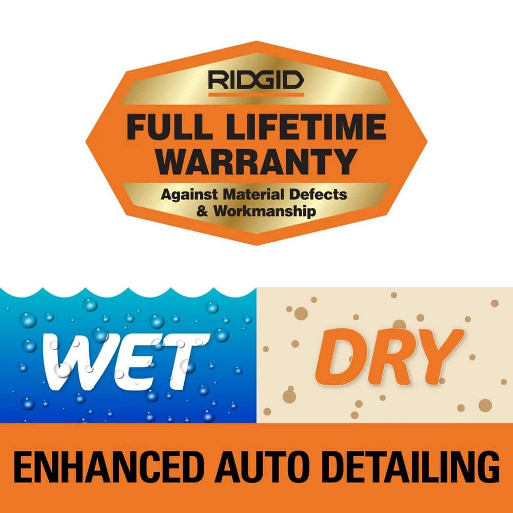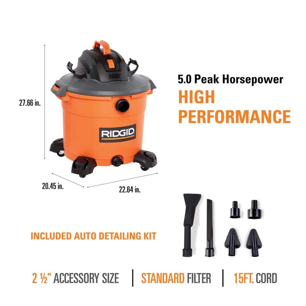 - Includes RIDGID 16 Gallon 5.0 Peak Horsepower Wet/Dry Shop Vacuum featuring an auto detailing kit – great for deep cleaning the interior of your vehicle