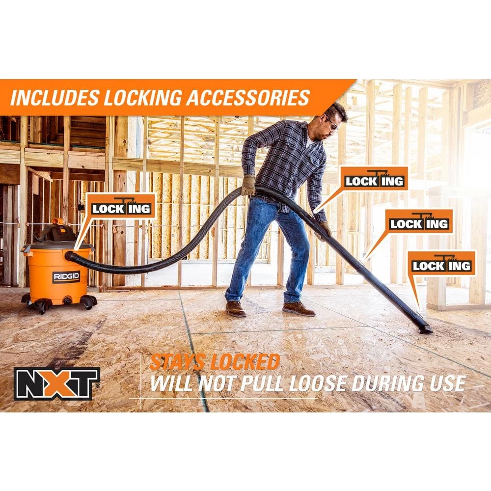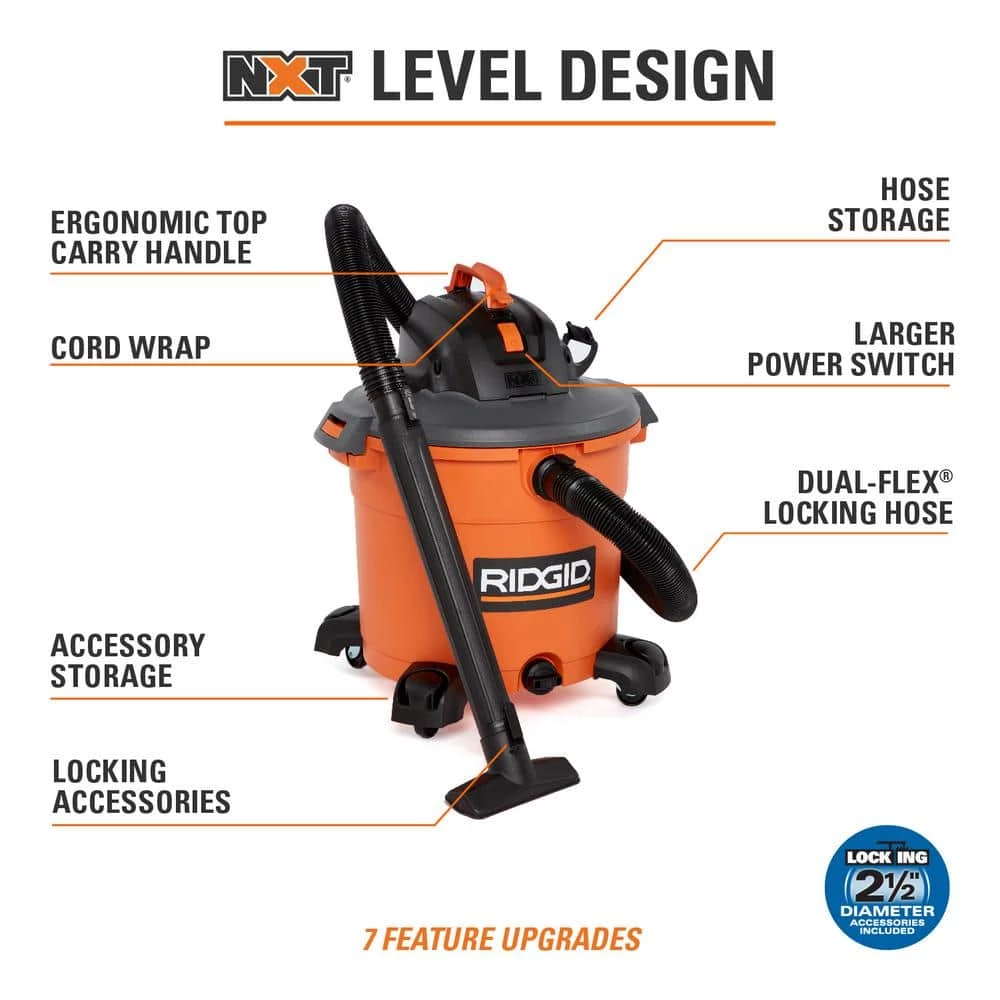 - Pair the RIDGID 16 Gallon NXT wet/dry vac with a dust collection bag (VF3502 Size A; sold separately) for quick and easy disposal and to keep the drum clean