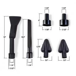 - Car cleaning kit includes claw nozzle for seats and floormats, crevice tool for in-between seats, soft bristle brush for cleaning vents, hard bristle brush for floor mats and seats and adapters to fit the 2-1/2 in. hose