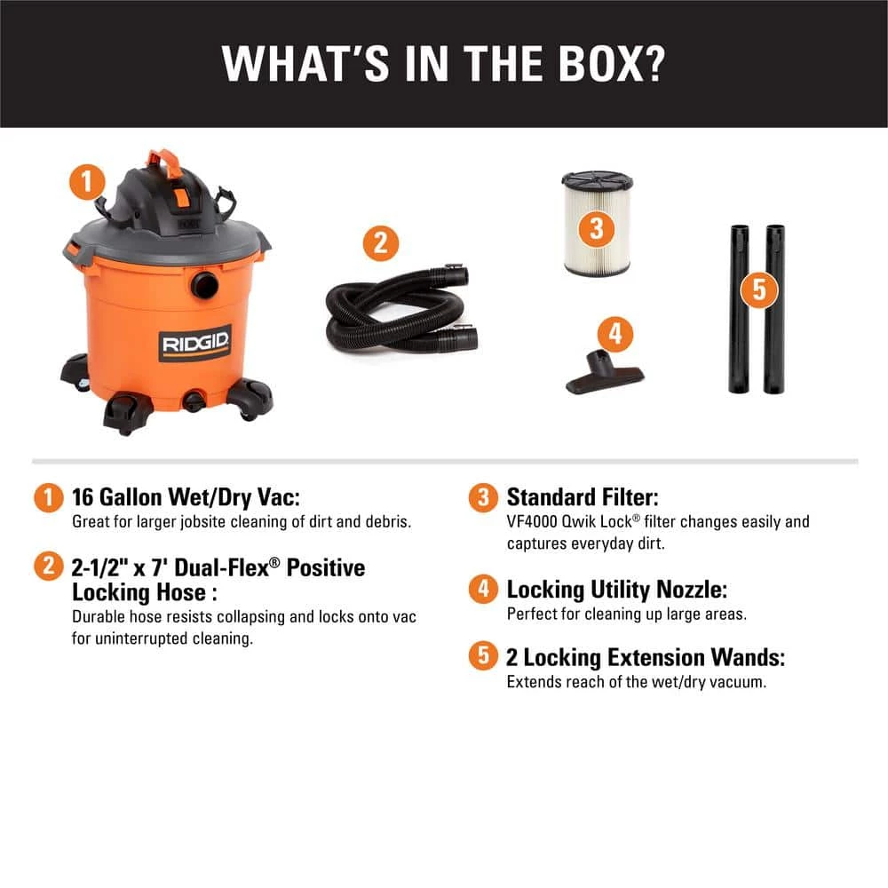 - Includes RIDGID 16 Gallon 5.0 Peak Horsepower Wet/Dry Shop Vacuum for all messes – big or small