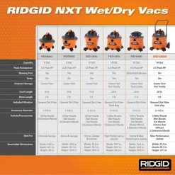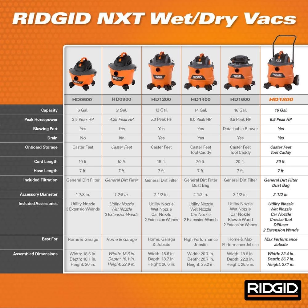 - Includes RIDGID 16 Gallon 6.5 Peak Horsepower NXT Wet/Dry Shop Vacuum with Cart – the vac that was built for the jobsite and to handle difficult cleanups