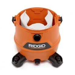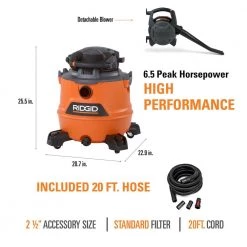 The RIDGID 16 Gallon 6.5 Peak Horsepower Wet/Dry Shop Vacuum with Detachable Blower features an additional hose that is 20 ft. long. This powerful, heavy-duty shop vac can be used for a variety of applications and ideal for outdoor messes while the extra hose provides additional reach on the job. The 6.5 peak horsepower motor is RIDGID’s highest-rated motor engineered for the pro who needs the most power and highest performance. The all-electric blower detaches from the vac and then attaches to the included blower wand to start clearing debris from your path. This vac includes shop vac attachments to customize to the job – 2 extension wands, utility nozzle, car nozzle, and wet nozzle. Extension wand attachments extend reach, utility nozzle cleans large areas and car nozzle helps with detail cleaning of carpet. Wet mess? No problem. The included wet nozzle attaches to suck up liquid spills faster and over larger areas. These attachments are 2-1/2 in. diameter and features locking technology for a snug fit while cleaning. Onboard storage provides spots for the 20 ft. cord and the included attachments while the comfort grip drum helps carry drum for easy lifting. Included standard filter (VF4000) captures general dust and debris Pro Tip: RIDGID recommends changing filters frequently to maintain the power of the vac and extend vacuum life – other filtration types sold separately. Add a dust collection bag (sold separately) to the vac to help with quick cleanup and disposal.