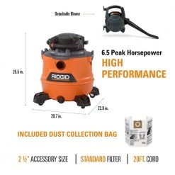 - Includes RIDGID 16 Gallon 6.5 Peak Horsepower NXT Wet/Dry Shop Vacuum with Detachable Blower and dust collection bags for heavy-duty cleanup and big outdoor projects