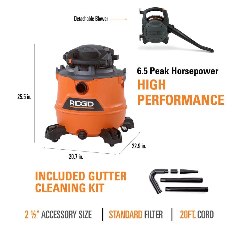 - Includes RIDGID 16 Gallon 6.5 Peak Horsepower Wet/Dry Shop Vacuum with Detachable Blower featuring a premium gutter cleaning kit for your all-in-one outdoor cleaning solution