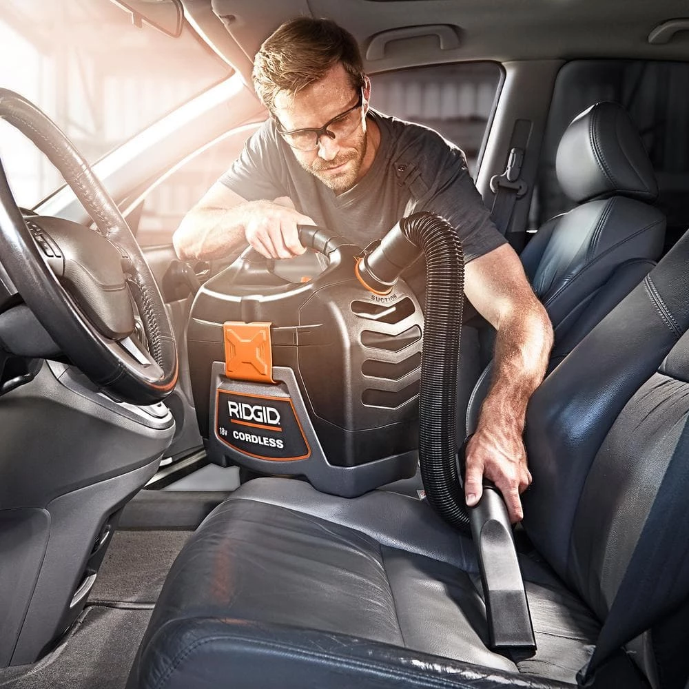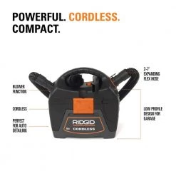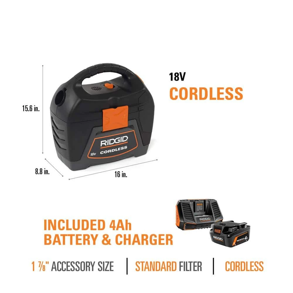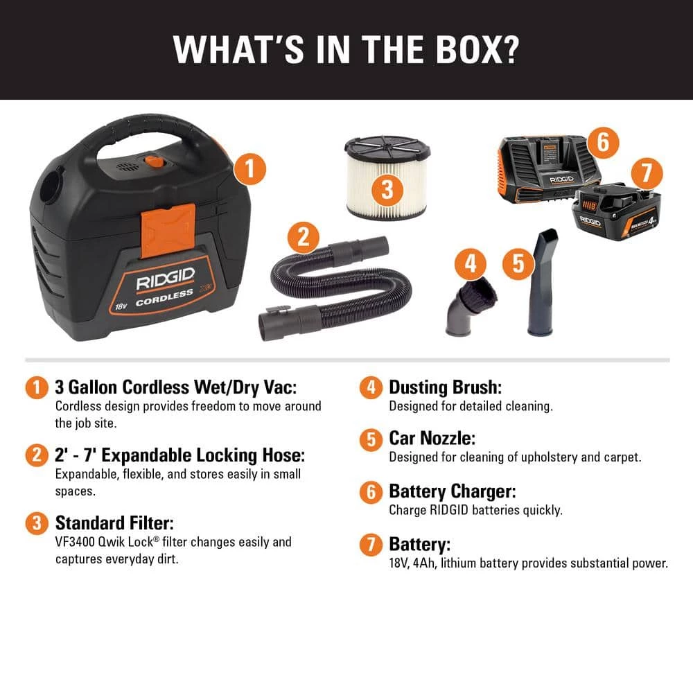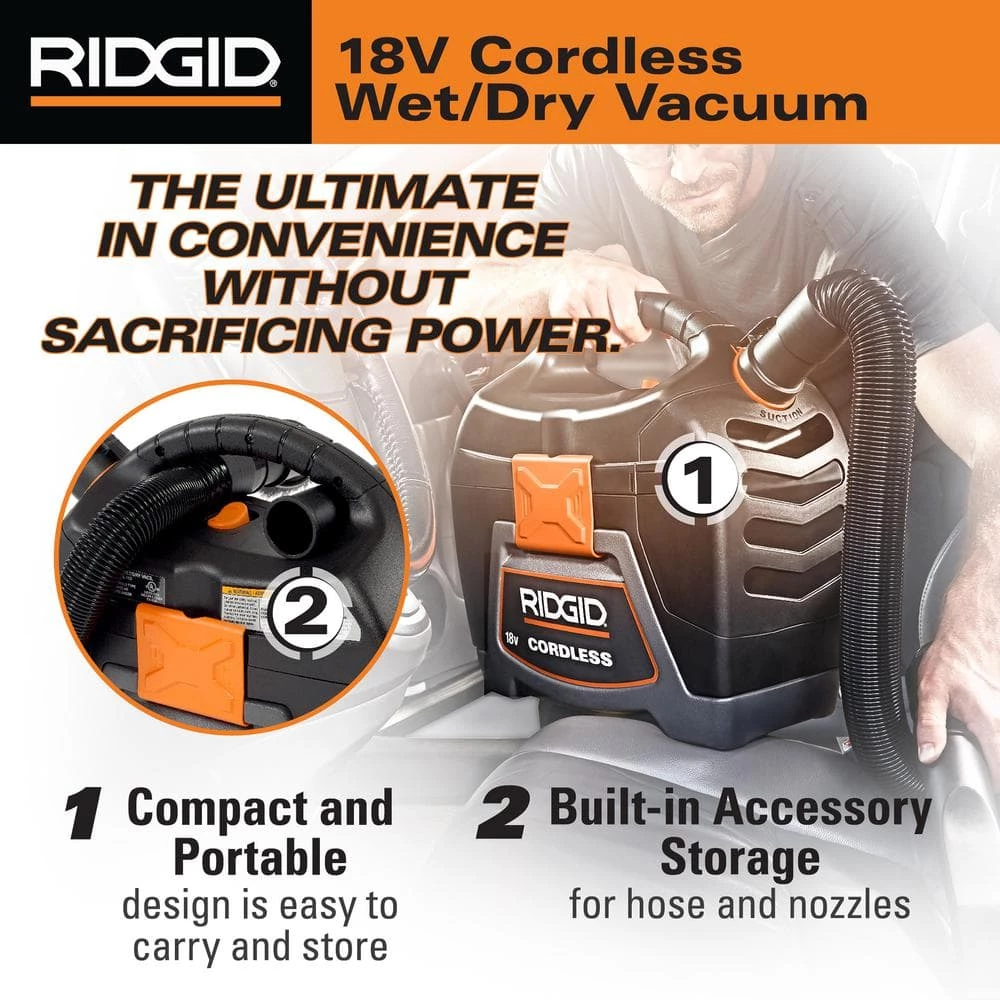 The RIDGID 3 Gallon 18-Volt Cordless Handheld Wet/Dry Shop Vac with Battery and Charger (included) comes with an expandable locking hose, dusting brush, car nozzle and standard filter (VF3400). This portable shop vac works in a variety of places, especially where plugs don’t. The battery-powered (battery and charger included), cordless wet dry vac from RIDGID is perfect for car cleaning and jobsite debris or anywhere that’s away from an outlet. This 3 Gal. wet/dry vacuum adapts to the existing 18-Volt RIDGID power tool battery system and is loaded with built-in accessory storage. A 1-7/8 in. locking hose that expands to 7 ft. is flexible and stores easily in small places. The dusting brush is designed for detailed cleaning by agitating carpeted areas to uplift dirt and debris while the car nozzle cleans upholstery and carpet with precision. RIDGID battery compatible with other RIDGID tools. Pro Tip: Replace RIDGID filters (sold separately) frequently to maintain the power of the vac and extend vacuum life. Everything you need to attack water and debris with a vengeance can be found in this RIDGID 3 gallon.