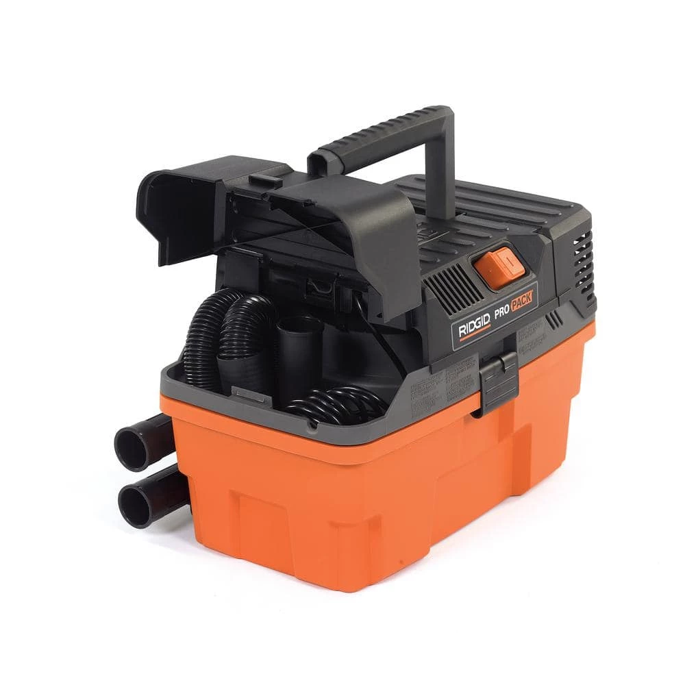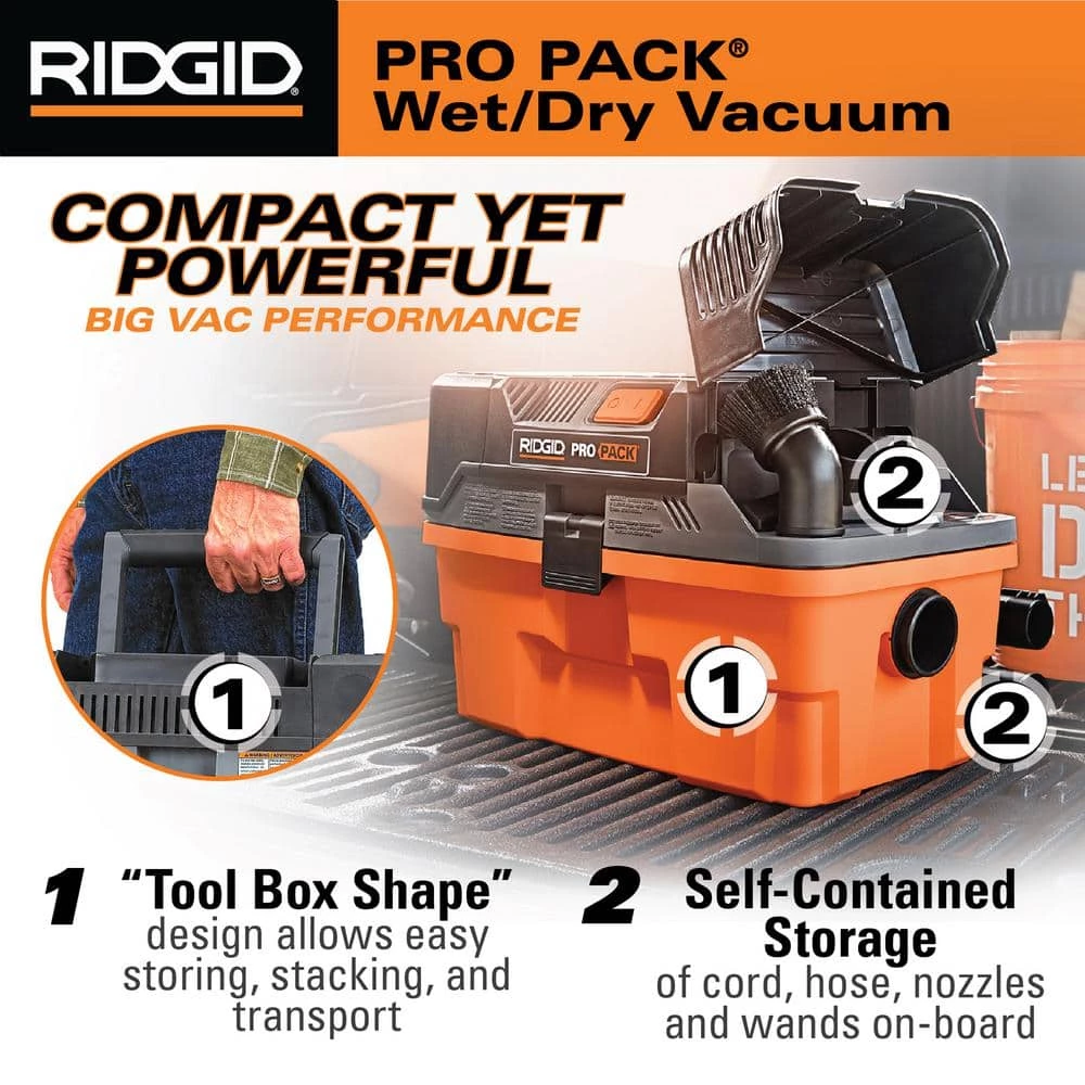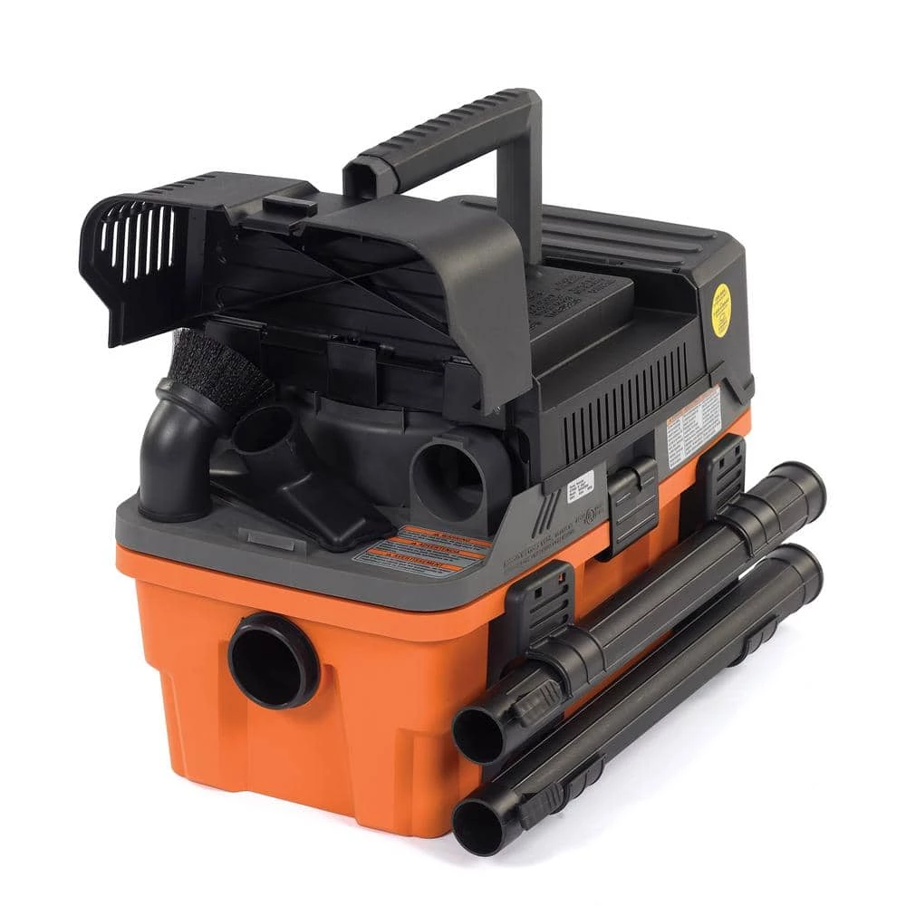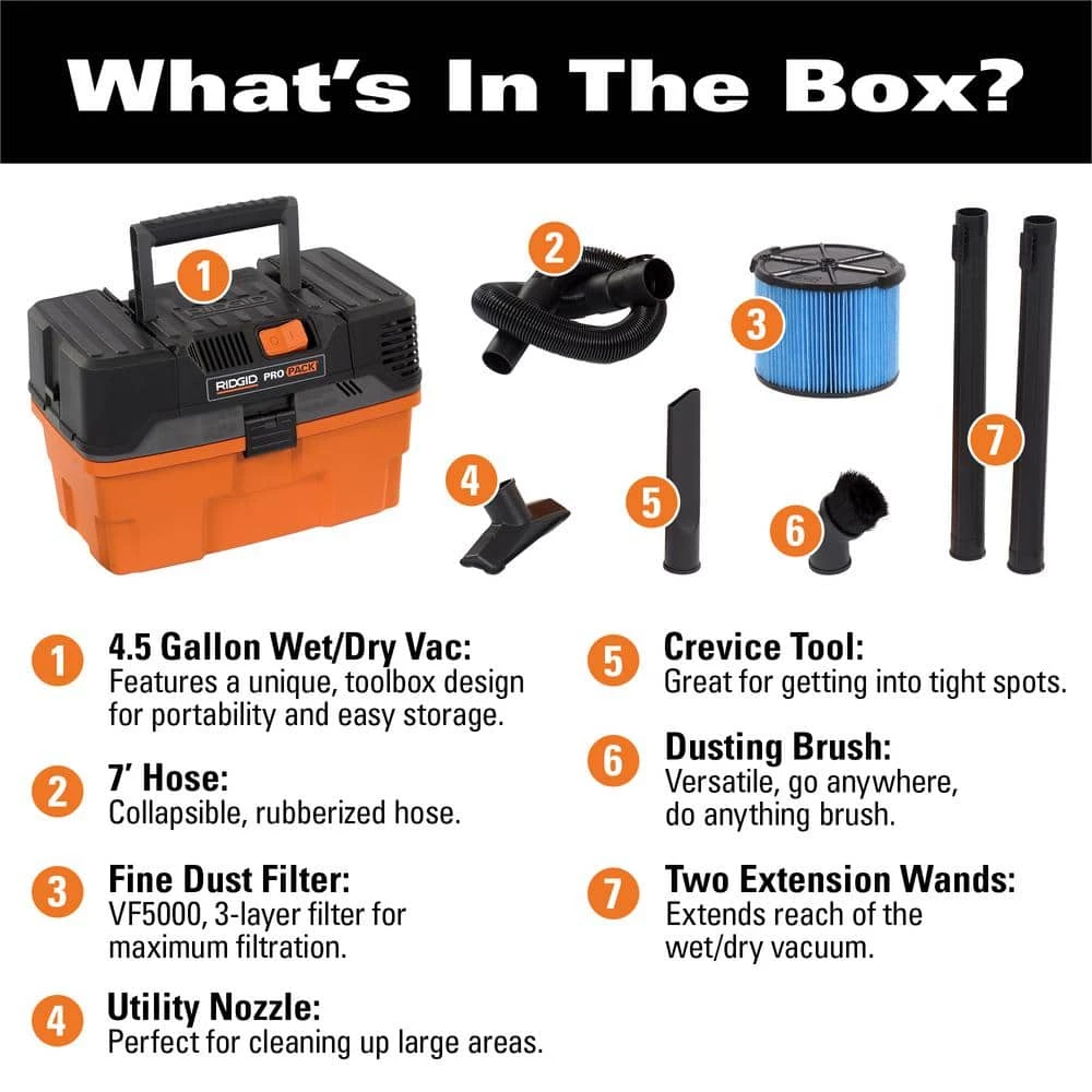 The RIDGID 4.5 Gal wet dry vac features a unique, toolbox design for portability and easy storage. This vacuum has a 5.0 peak horsepower motor for powerful suction and a 3-layer filter for maximum filtration. This wet/dry vacuum has convenient accessory storage built in and includes a 7 ft. collapsible, rubberized hose, 2 wands, a utility nozzle, a crevice tool and a dusting brush.