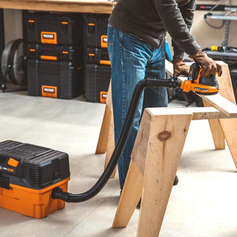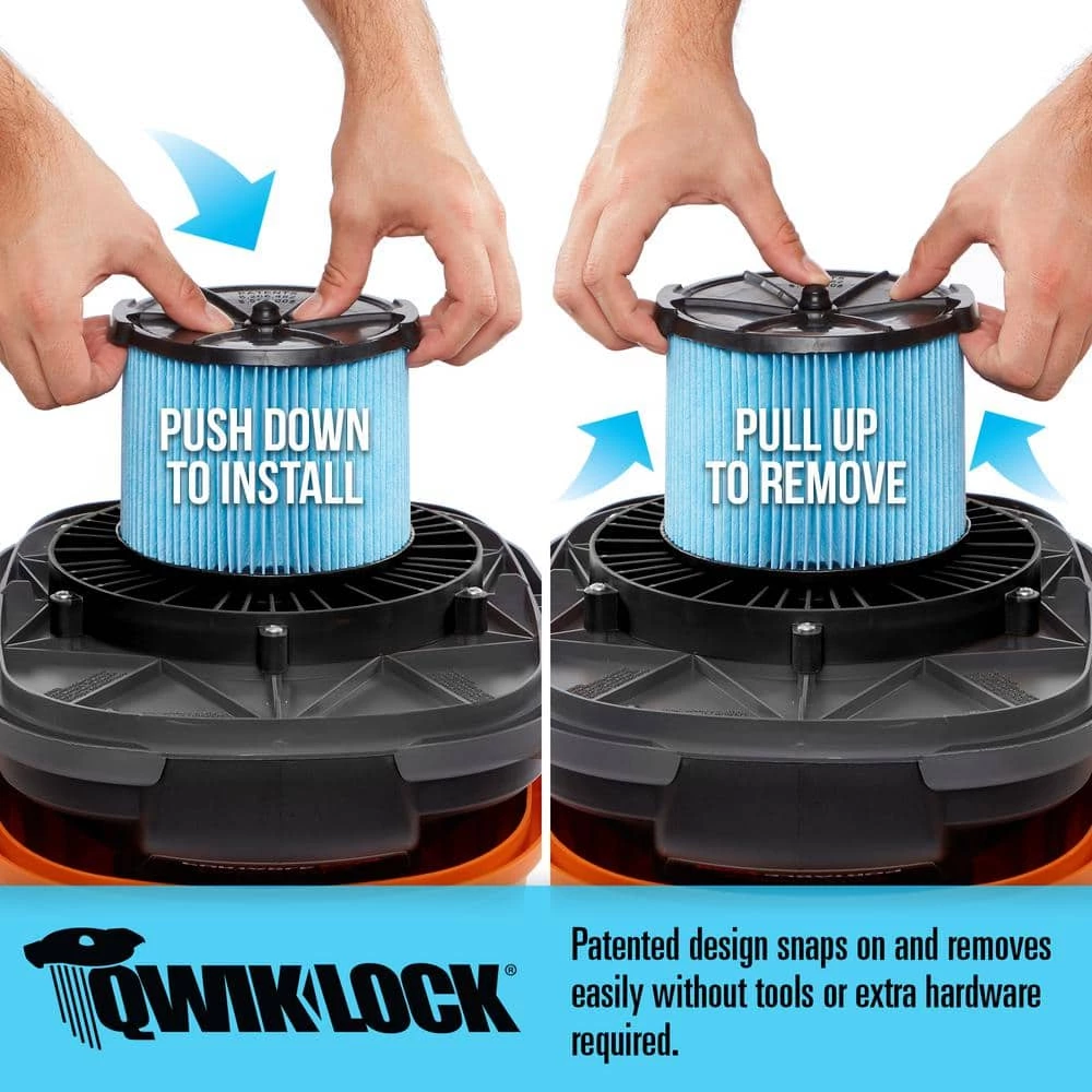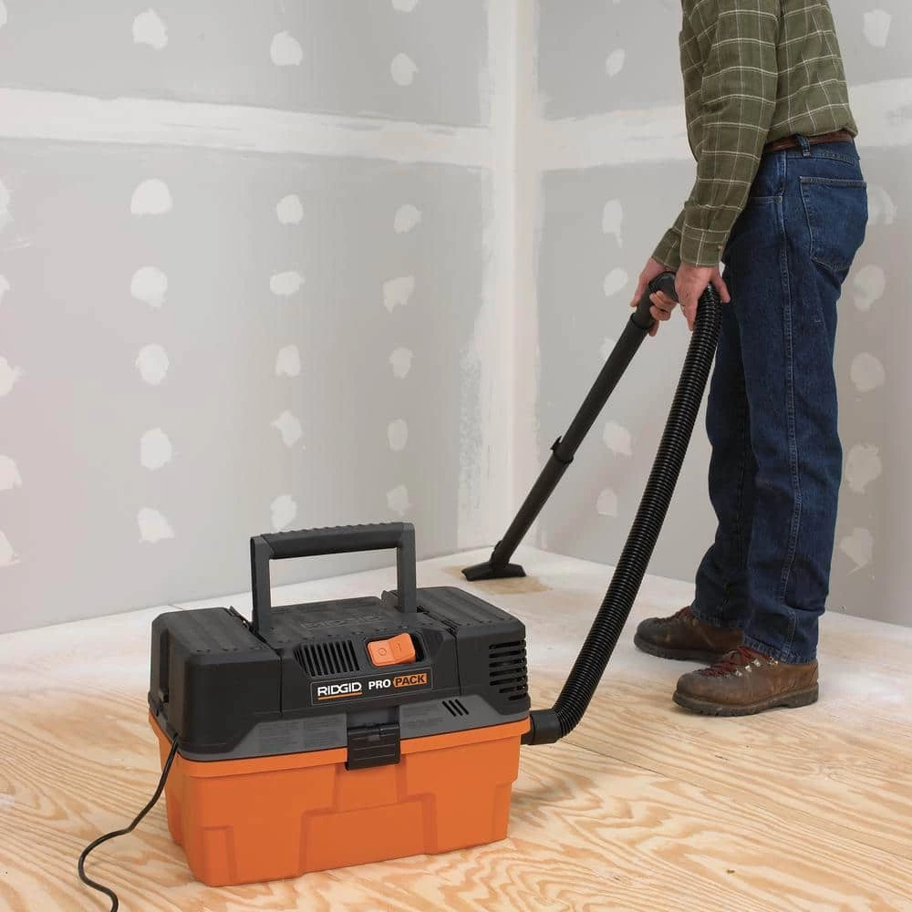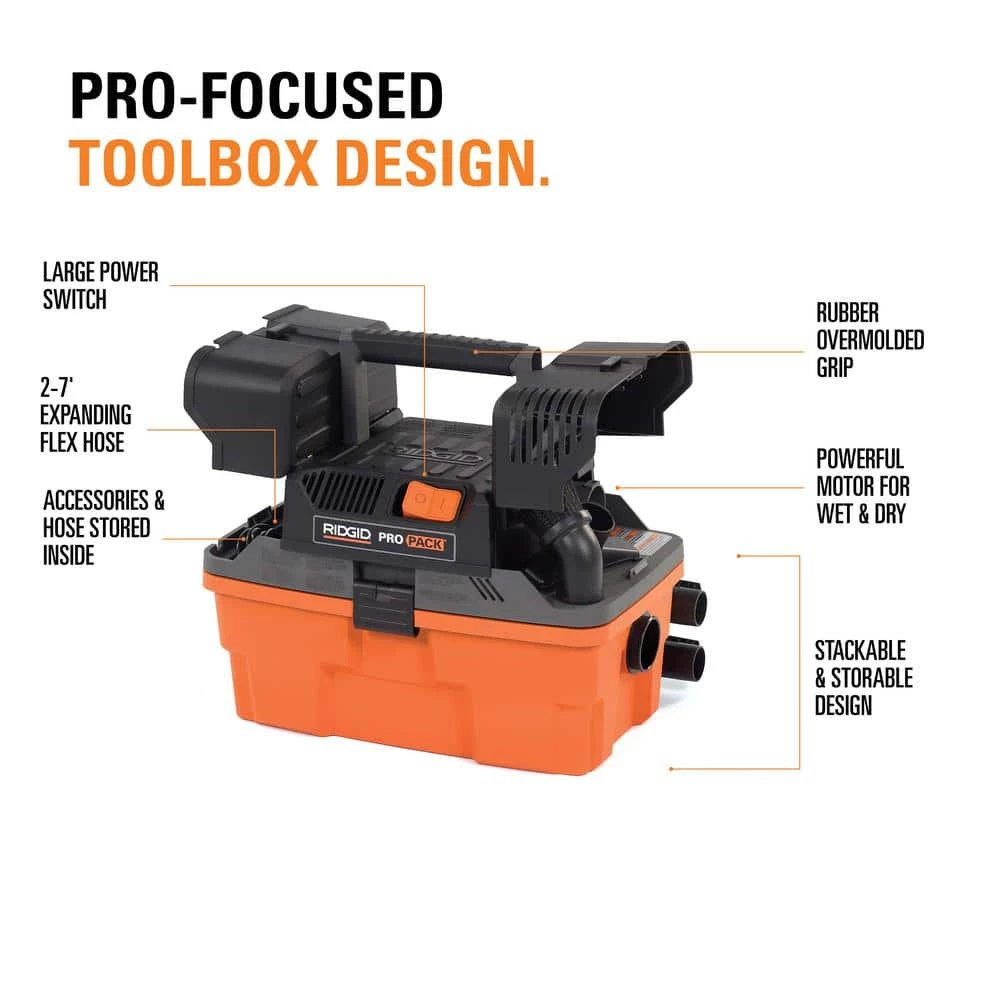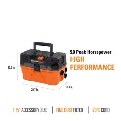 The RIDGID 4.5 Gal wet dry vac features a unique, toolbox design for portability and easy storage. This vacuum has a 5.0 peak horsepower motor for powerful suction and a 3-layer filter for maximum filtration. This wet/dry vacuum has convenient accessory storage built in and includes a 7 ft. collapsible, rubberized hose, 2 wands, a utility nozzle, a crevice tool and a dusting brush.