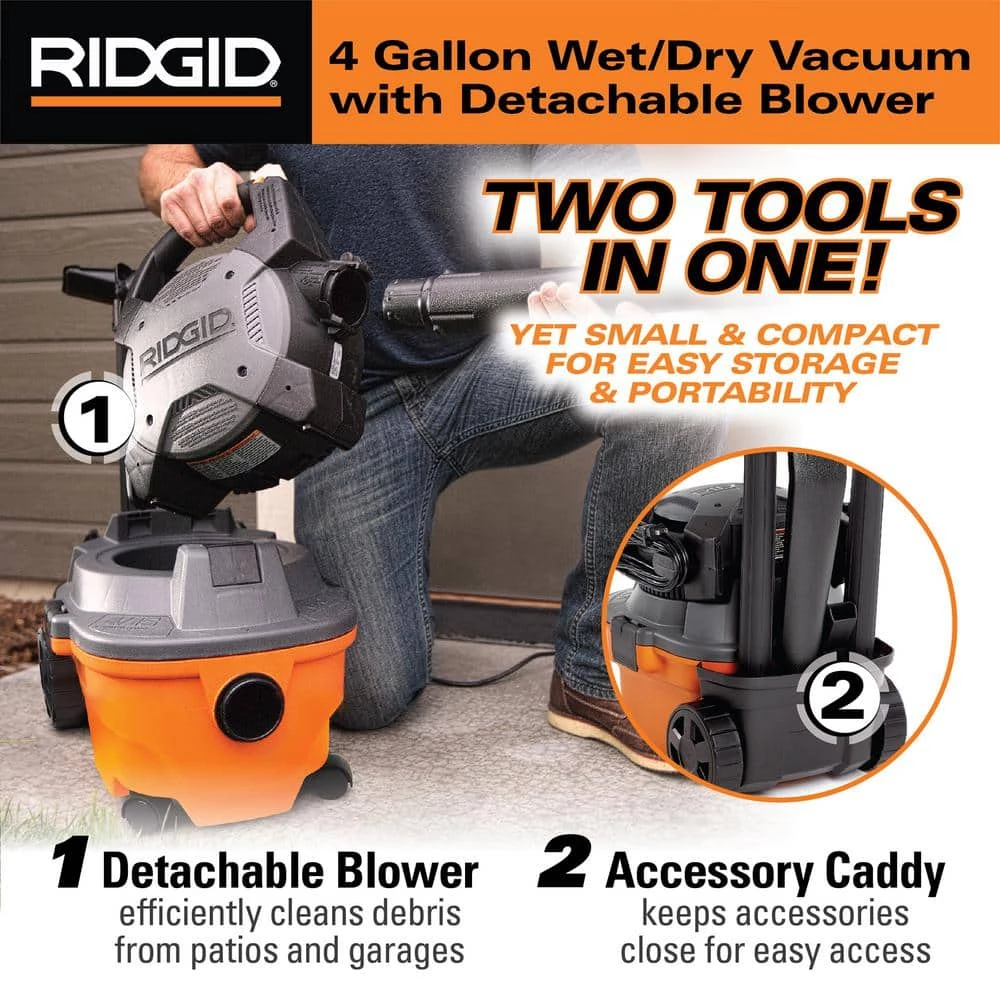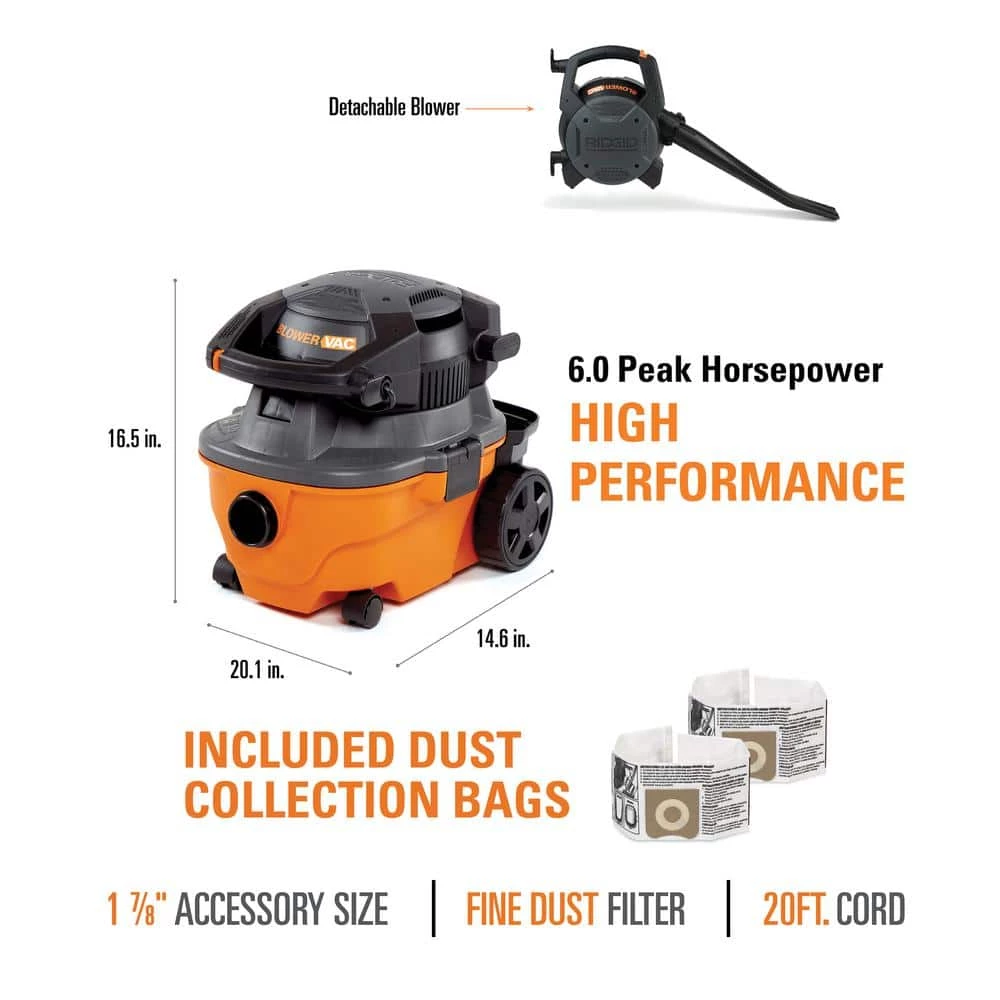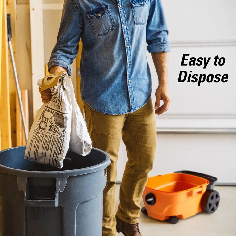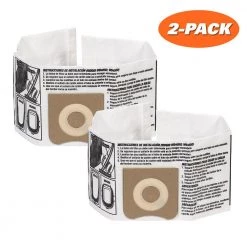 The RIDGID 4 Gal. wet/dry vac is a multi-functional tool that combines portable power and a handheld blower. This compact powerhouse packs a heavy duty 6.0 peak horsepower rated motor to tackle even the messiest jobs. The power head of the wet/dry vacuum detaches and quickly converts into a handheld blower with a locking wand that outperforms most dedicated leaf blowers. The quick-release cord wrap lets you spend less time unwrapping the 20 ft. cord and more time on the job. The caddy conveniently keeps your accessories and the hose close at hand. It is 2 incredible tools in one. Keep the mess contained with the RIDGID (size C) wet/dry vacuum dust bag. With this 2-pack, you can always be prepared for large project cleanups so that easy disposal is right at your fingertips. RIDGID wet/dry vacuums and helps clean up small, dry debris such as drywall dust. The addition of the dust bag allows for a no-mess drum while cleaning. Simply remove the bag from the vacuum and toss for a quick cleanup – no drum lifting needed. These high-efficiency filter bags can help vacuum performance and provide a cleaner operation because it minimizes debris clogs in the filter to increase the filter life.