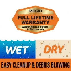 - Compatible RIDGID cartridge filters and dust collection bags: VF3400 (standard filter), VF3500 (fine dust filter), VF3600 (HEPA media filter), VF3700 (wet application filter), VF3501 (dust collection bags), VF3511 (fine dust filter and dust bag kit), VF3437 (standard filter and wet filter kit)