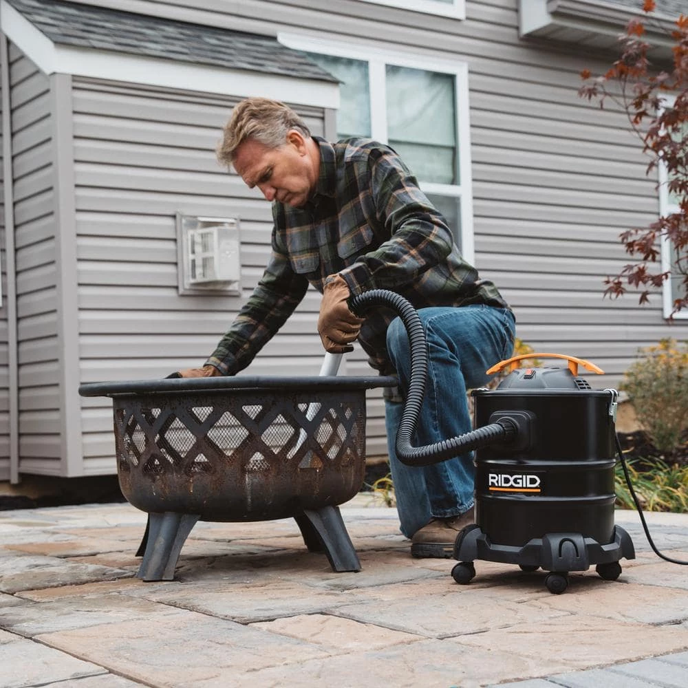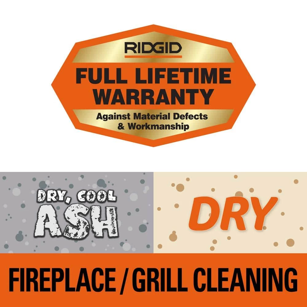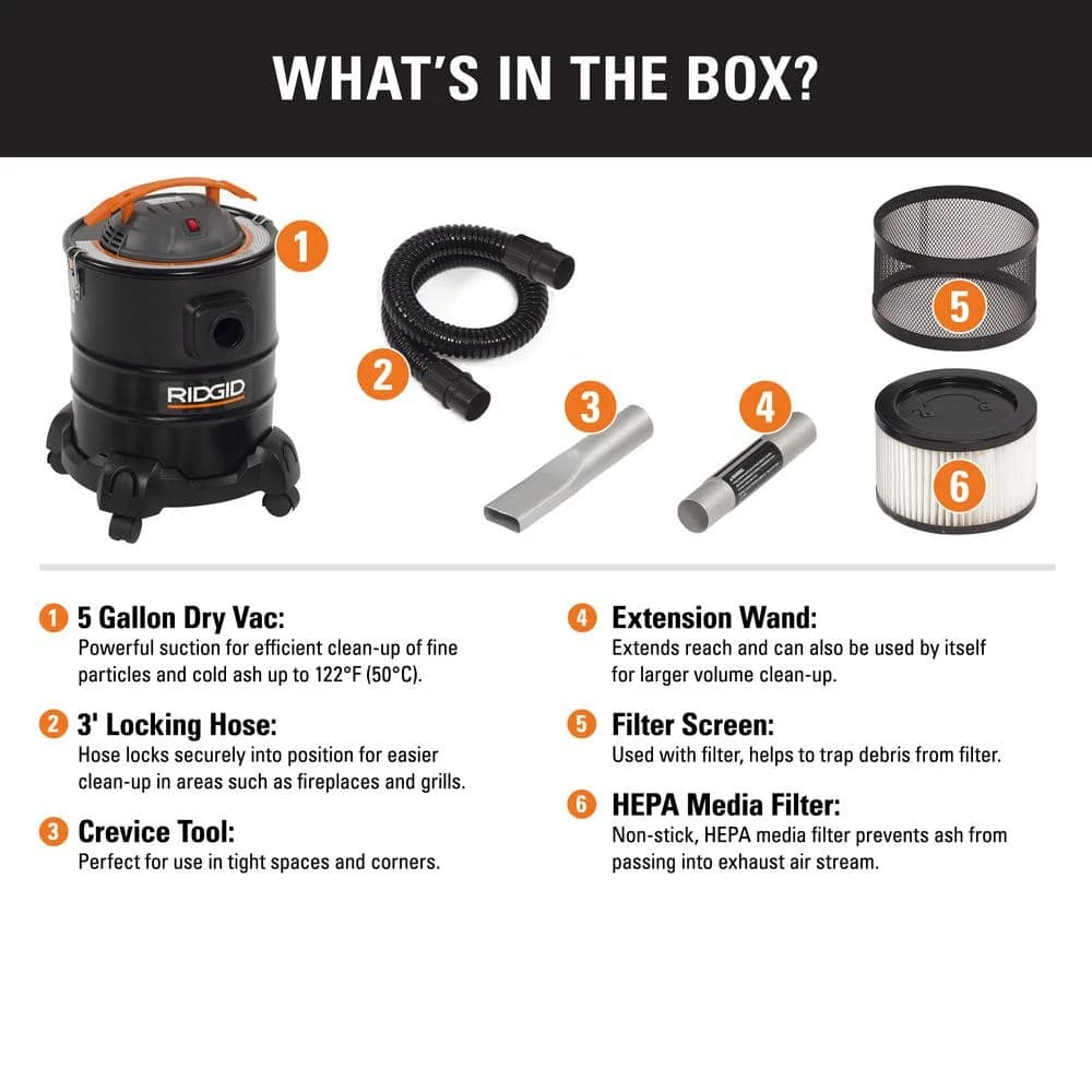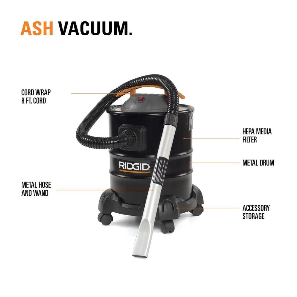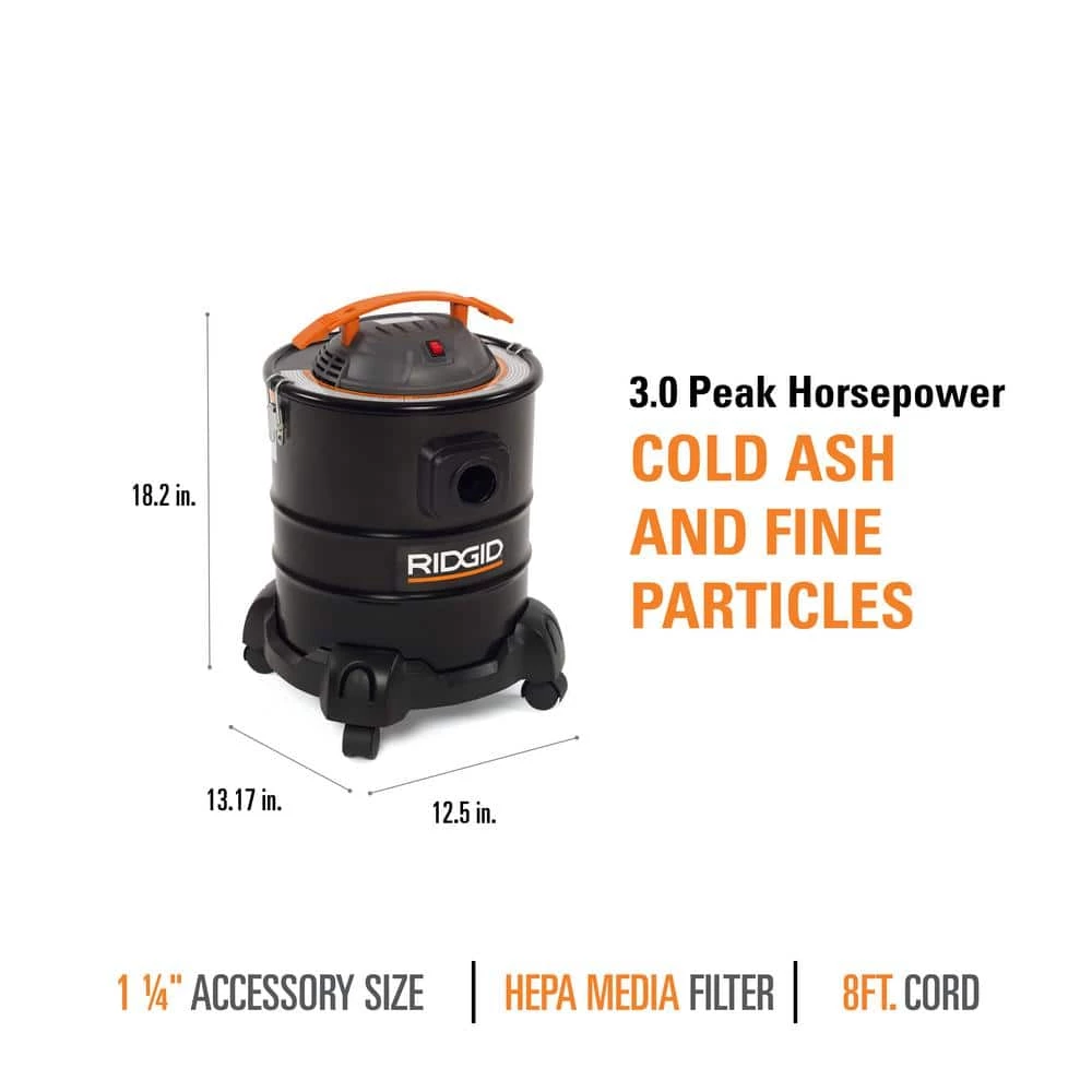 The RIDGID 5 Gal. 3.0 Peak HP Ash Vacuum Cleaner is essential for messes that require a safe means of disposal. The metal drum is made for a wide range of cold ash and fine particle cleaning applications, up to 122°F (50°C). This vac has a powerful 3.0 peak HP motor with a non-stick HEPA media filter that prevents ash from passing into exhaust air stream. The carrying handle also provides storage for the 8 ft. power cord. Includes Vac, 3 ft. Locking Hose, Metal Wand, Metal Crevice Tool and HEPA Filter.