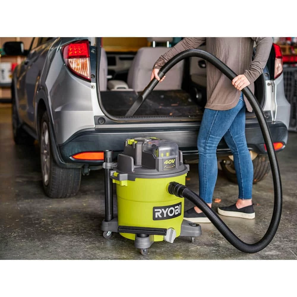 - Includes: (1) RY40WD01 40V 10 Gallon Wet/Dry Vacuum, (1) Cartridge Filter (dry use), (1) Foam Filter (wet use), (1) 8 ft. x 1-7/8 in. Hose, (2) Extension Wands, (1) Crevice Tool, (1) Floor Nozzle, (1) Drain Plug, (2) Extension Wand Clips, (4) Casters, (1) 40V 4.0 Ah Battery, (1) 40V Charger, and Operator’s Manuals
